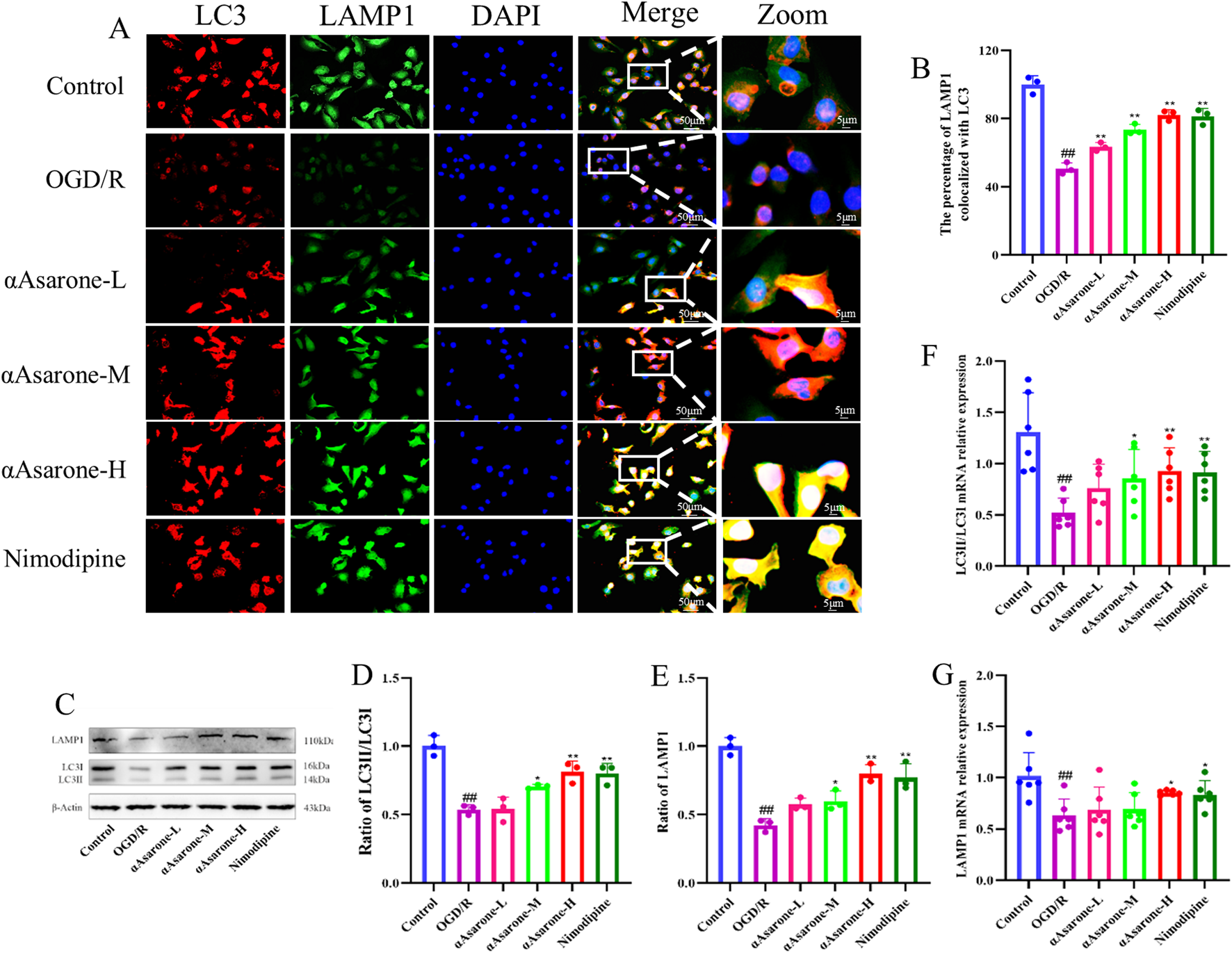 αAsarone activated the autophagy in HT22 cells. (A) Representative images of fluorescent staining for DAPI, LAMP1 and LC3 in the HT22 cells. Scale bar = 50 µm. Green puncta: LAMP1, red puncta: LC3, bule puncta: DAPI (n = 3). (B) The percentage of LAMP1 colocalized with LC3. (C–G) The western blots and RT-qPCR of LAMP1and LC3, as well as the quantitative analysis. All data are expressed as mean ± SD, Statistical analysis showed ##P < 0.01 vs. the control group, *P < 0.05, **P < 0.01 vs. the OGD/R group.