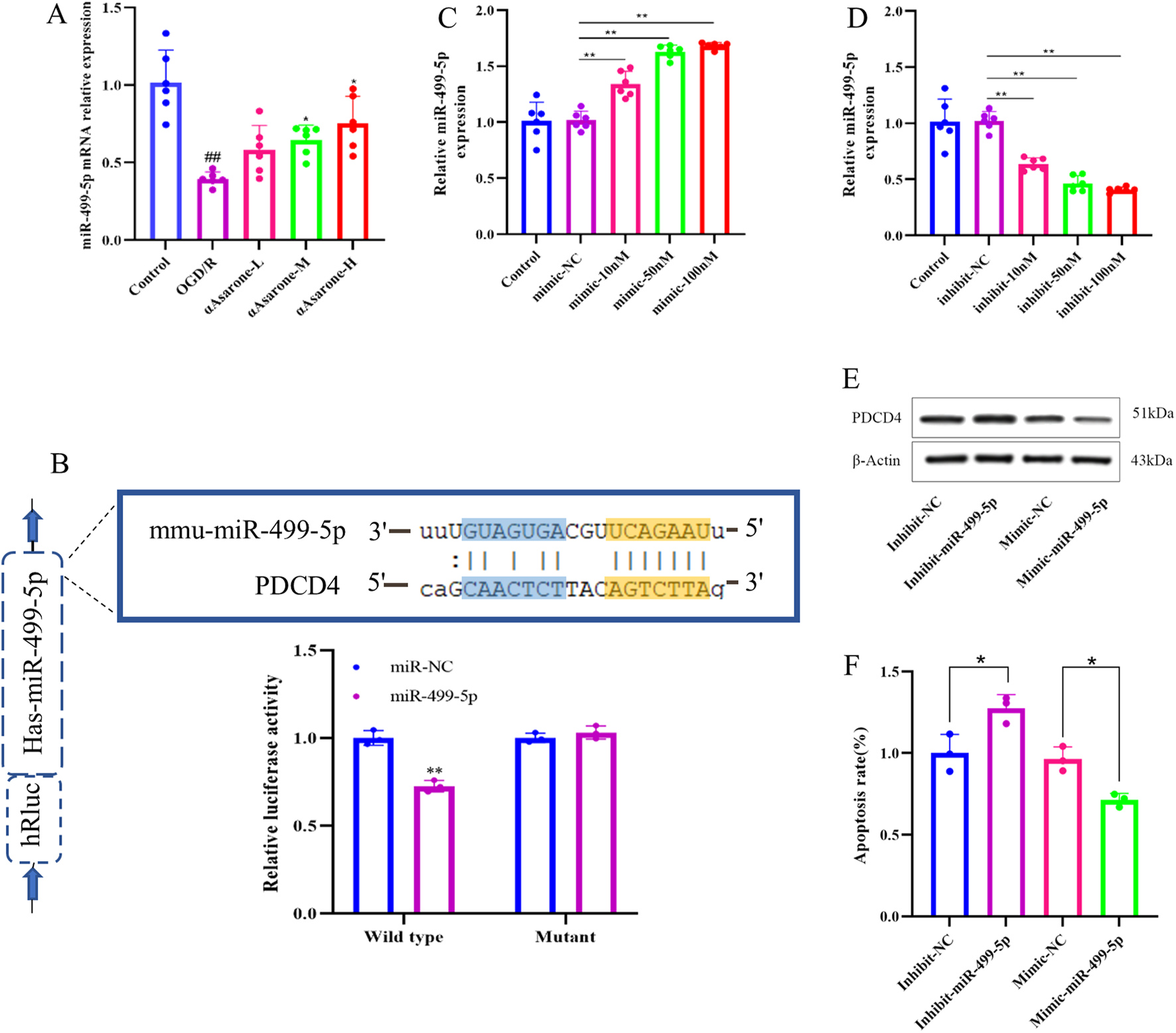 Following OGD/R injury, the expression levels of miR-499-5p in HT22 cells was observed to decrease after 6 h, Further, it was found that αAsarone enhanced the expression level of miR-499-5p in a dose-dependent manner. (Figure 3A, P < 0.01). Luciferase reporter gene assays demonstrated a reduction in luciferase activity in HT22 cells that were co-transfected with miR-499-5p mimics and the wild-type PDCD4 plasmid. Conversely, co-transfection with the mutant PDCD4 plasmid did not yield a significant effect, suggesting a direct physical interaction between PDCD4 and miR-499-5p (Figure 3B). Subsequent transfected with miR-499-5p inhibitors and mimics led to a significant alteration in miR-499-5p expression within HT22 cells and transfection efficiency reached 70% at a concentration of 50 nM, which was therefore selected as the concentration for subsequent transfections (Figures 3C, D). Western blot analysis indicated that PDCD4 was upregulated in HT22 cells transfected with the miR-499-5p inhibitor, whereas it was downregulated in cells transfected with the miR-499-5p mimic (Figures 3E, F).