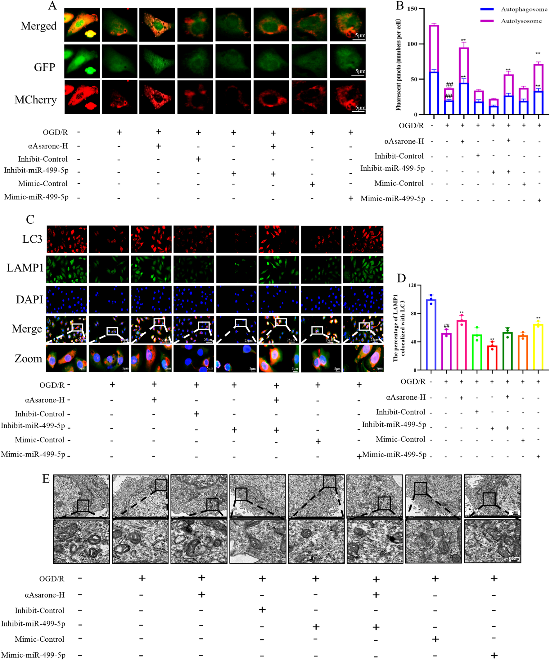 The effects of αAsarone on autophagy were examined by WB, RT-qPCR, immunofluorescence colocalization, transmission electron microscope, and autophagic flux activity was measured by infecting HT22 cells with mRFP-GFP-LC3 adenovirus. And then, cells were transfected with both mimic-miR-499-5p and inhibit-miR-499-5p to investigate the role of miR-499-5p in regulating the effects of αAsarone on stroke. To further clarify the protective effect of αAsarone in vivo, TTC staining, neurological function score, H&E staining, Nissl staining, Laser speckle contrast imaging, transmission electron microscopy, immunofluorescence colocalization, WB and RT-qPCR were performed in the MCAO mice.