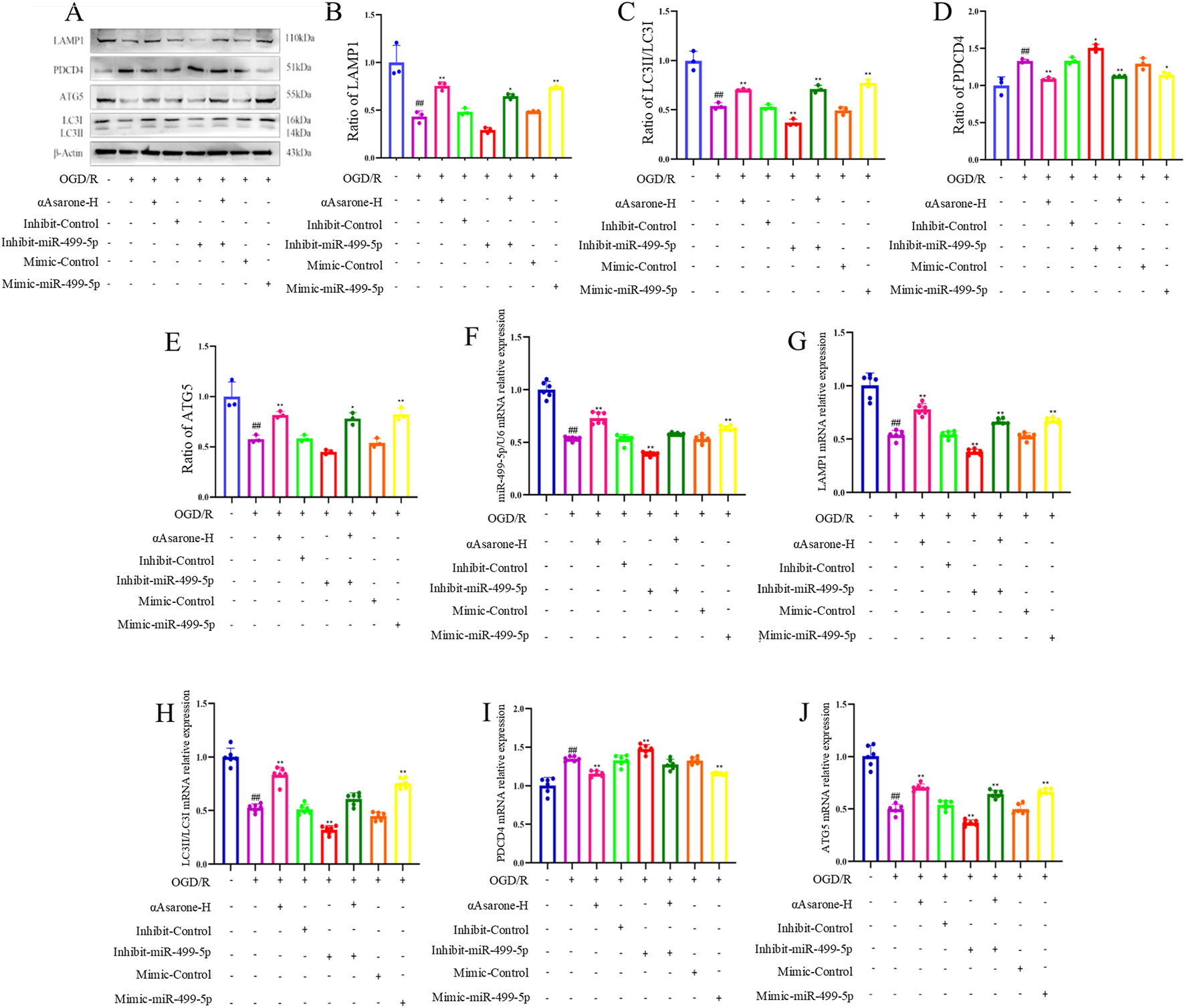 miR-499-5p/PDCD4/ATG5 mediated the activation of autophagy by αAsarone. (A–J) The western blots and RT-qPCR of PDCD4, ATG5, LAMP1 and LC3, as well as the quantitative analysis. All data are expressed as mean ± SD, Statistical analysis showed ##P < 0.01 vs. the control group, *P < 0.05, **P < 0.01 vs. the OGD/R group.