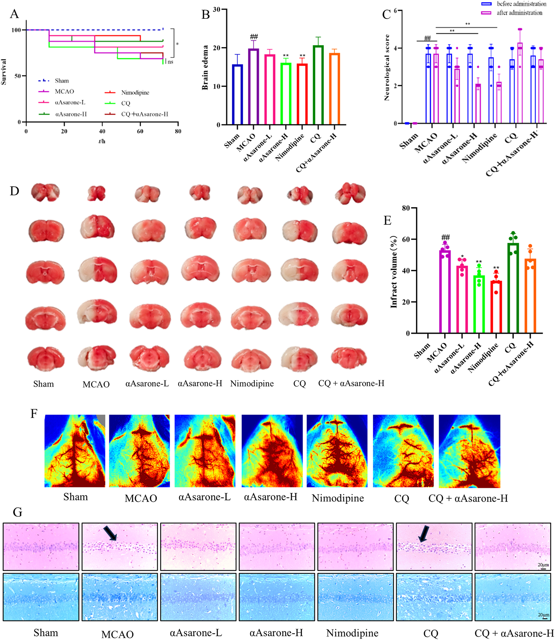 The establishment of a stroke model in mices was conducted using an altered method of middle cerebral artery occlusion (MCAO), utilizing 3% isoflurane for anesthesia in adult male SPF mice. During the surgical procedure, the body temperature was maintained at 37°C. An incision along the midline of the neck was created to gain access to and isolate the common carotid artery, the external carotid artery, and the internal carotid artery. Nylon sutures were then placed approximately 10 mm deep from the common carotid artery to the internal carotid artery. After a duration of ischemia lasting 1 h, the nylon suture was taken out to promote reperfusion. In the sham group, the identical surgical procedure was carried out, but the nylon suture was not inserted. After 1 h of stroke, behavioral assessments were conducted using the Zealonga scoring method (Longa et al., 1989). The evaluation criteria are as follows. 0 points: There are no symptoms of neurological disorder and the patient’s functions are normal. 1: Unable to fully extend the contralateral forepaw. 2: Contralateral hemiplegia with crawling and turning. 3: The body leans toward the hemiplegic side when walking. 4: Unable to walk alone, unconscious; 5: death. The mice were subsequently randomized into seven groups: Sham, Model, αAsarone (10 and 40 mg/kg), Nimodipine (1.6 mg/kg), CQ (80 mg/kg), and CQ combined with αAsarone (40 mg/kg). Each drug was injected intraperitoneally into mice once for 3 consecutive days.