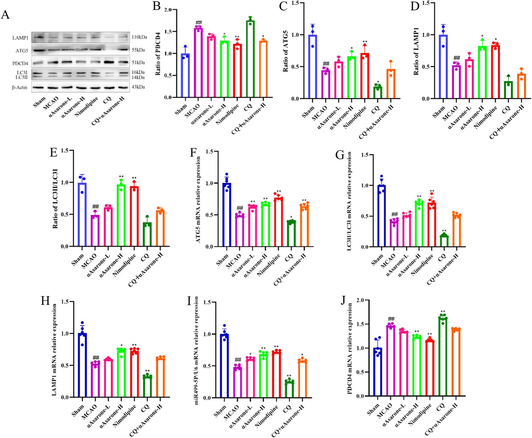 Nimodipine was purchased from Hunan Baicao Pharmaceutical Co., Ltd. (Hunan, China). Chloroquine (CQ) was purchased from MCE (Shanghai, China). αAsarone was purchased from Yuanye biological company (Shanghai, China), with purity ≥98%. SYBR Green Real-Time PCR Master Mix and gDNA remover ReverTra qPCR RT Master Mix were provided by Toyota CO., Ltd., located in Toyota, Japan. Meanwhile, the BCA Protein Assay Kit was sourced from Biosharp Labgic Technology CO., Ltd., based in Hefei, China. Antibodies for ATG5, LC3I, and LC3II were obtained from Proteintech. The PDCD4, LAMP1, goat anti-mouse and goat anti-rabbit were offered by Chengdu Zhengneng Biology Co., Ltd. (Chengdu, China).