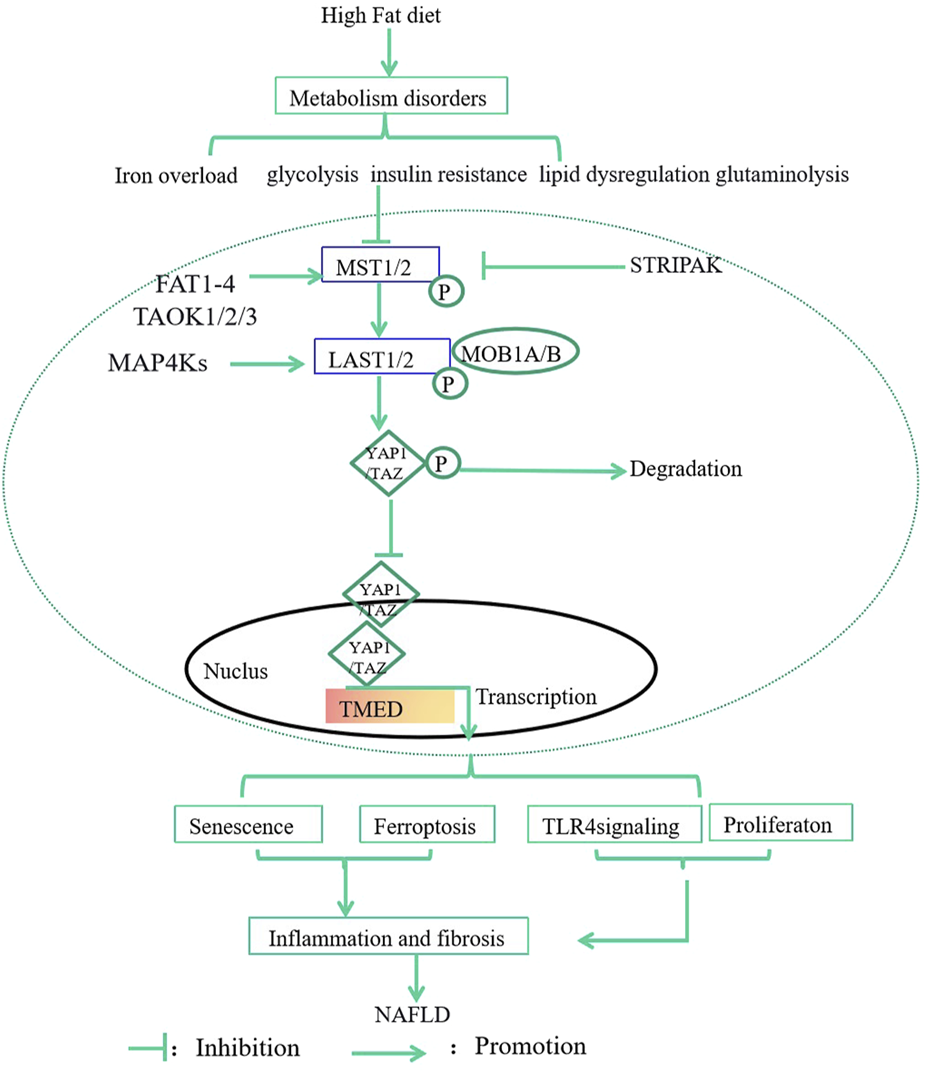 The Hippo-YAP1/TAZ pathway is also found to regulate metabolic disorders. Moreover, the Hippo-YAP1/TAZ pathway is involved in the regulation of senescence and ferroptosis, inflammation, and fibrosis caused by metabolic disorders in the MASLD (Sztolsztener et al., 2020).