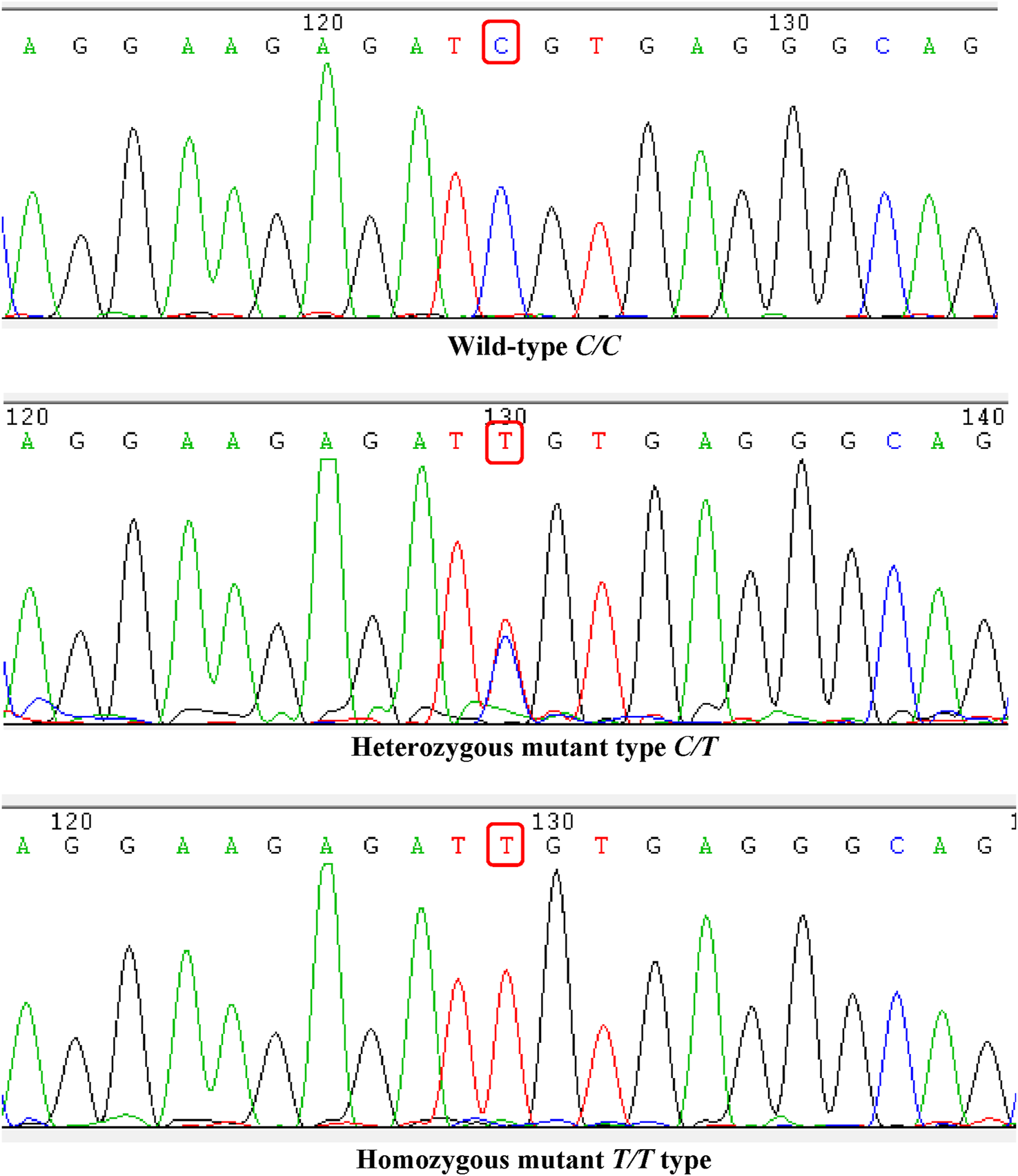 All patients in the cohort were genotyped for ABCB1-rs1045642, which showed that there were 35 CC types (wild type, where C represents the wild allele), 48 CT types (heterozygous mutation, where C represents the wild allele and T represents the mutant allele), and 18 TT types (homozygous mutation, where T represents the mutant allele). The sequencing results are shown in Figure 1. The genotypes of the study samples are in line with the Hardy–Weinberg equilibrium (χ2 = 0.048, p > 0.05), which suggests that the patients chosen are representative and suitable for further research (Figure 1).