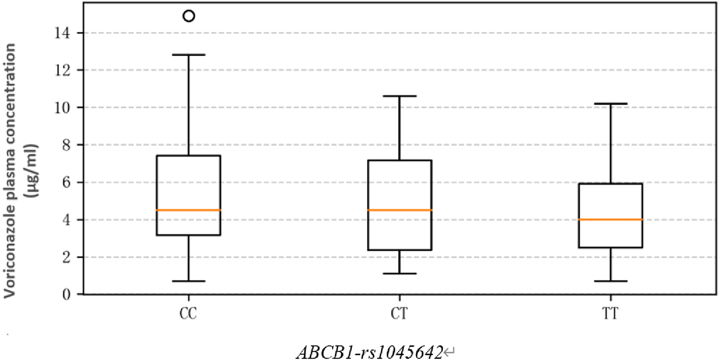 The average Cmin of the study cohort was 4.5 (3.10, 6.90) mg/L, and the linear range was 0.5–16 mg/L. The voriconazole plasma trough concentrations (mg/L) in patients with different genotypes of ABCB1-rs1045642 were as follows: CC 4.50 (3.15, 7.40); CT 4.50 (3.00, 6.93); TT 4.00 (2.67, 6.20). The results show that the Cmin values in the CC group are higher than those in the CT and TT groups, but there is no significant difference (χ2 = 0.095, p = 0.623). Thus, genotype differences were not found to have significant effects on the plasma trough concentrations (Figure 2).