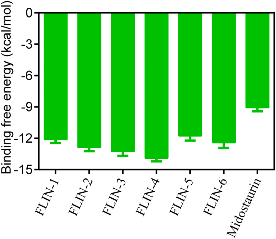 Figure 2. The binding free energy (kcal/mol) of FLINs 1–6, with lower values denoting higher affinity for FLT3 and implying a more potent inhibitory activity.