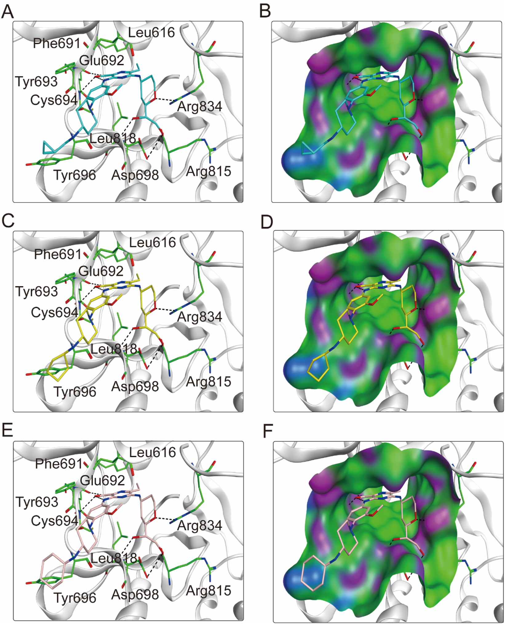 Figure 4. The binding modes of FLINs 1-3 to FLT3. (A, B) FLIN-1, cyan; (C, D) FLIN-2, yellow; (E, F) FLIN-3, pink. Residues of FLT3 in the binding surface are shown as green sticks. The hydrogen bonds are represented in black dashed lines. The pocket surfaces of the FLT3 are shown as H-bonding (purple), hydrophobicity (green), and mild polar (blue) regions.