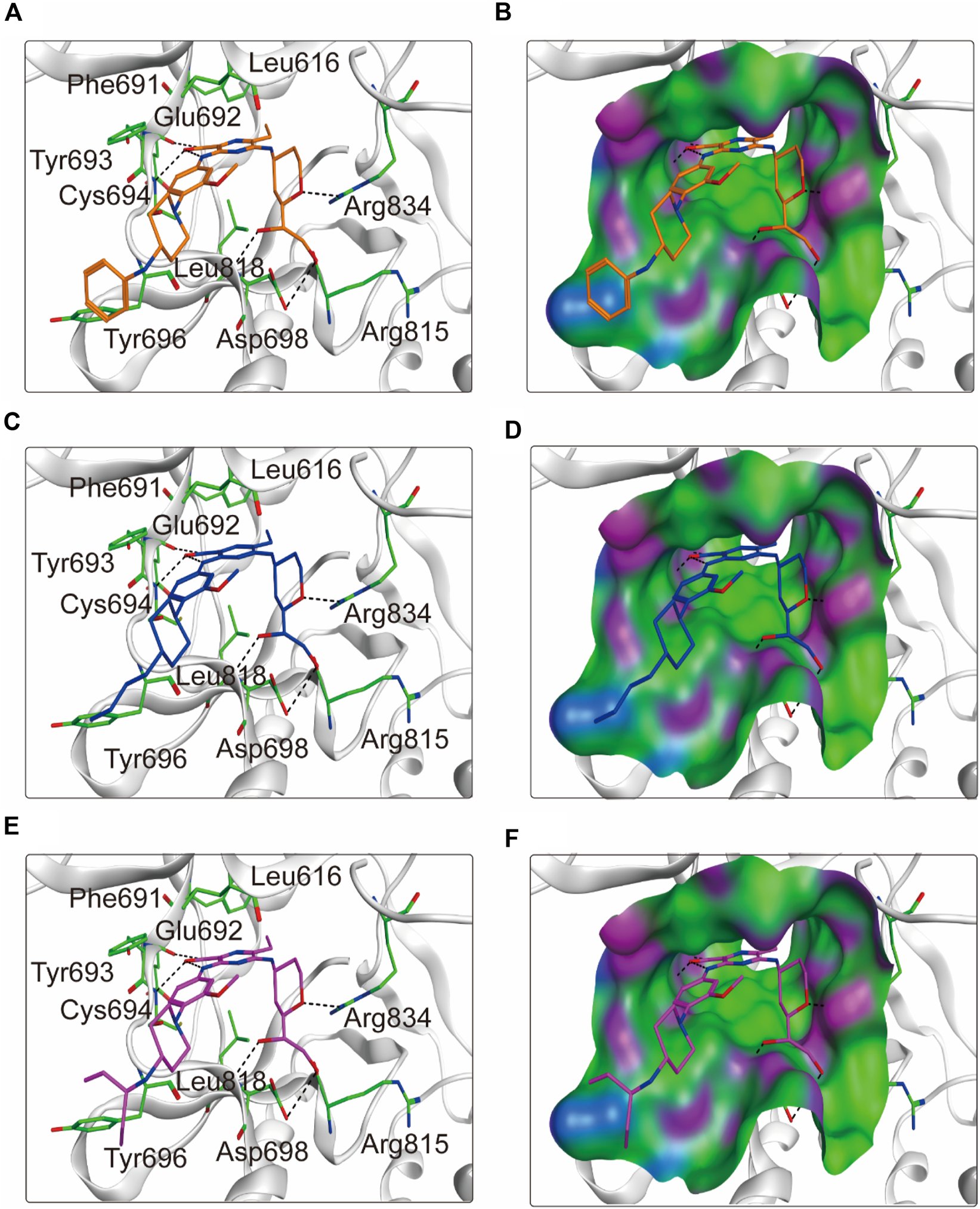 Figure 5. The binding modes of FLINs 4–6 to FLT3. (A, B) FLIN-4, orange; (C, D) FLIN-5, blue; (E, F) FLIN-6, purple. Residues of FLT3 in the binding surface are shown as green sticks. The hydrogen bonds are represented in black dashed lines. The pocket surfaces of the FLT3 are shown as H-bonding (purple), hydrophobicity (green), and mild polar (blue) regions.