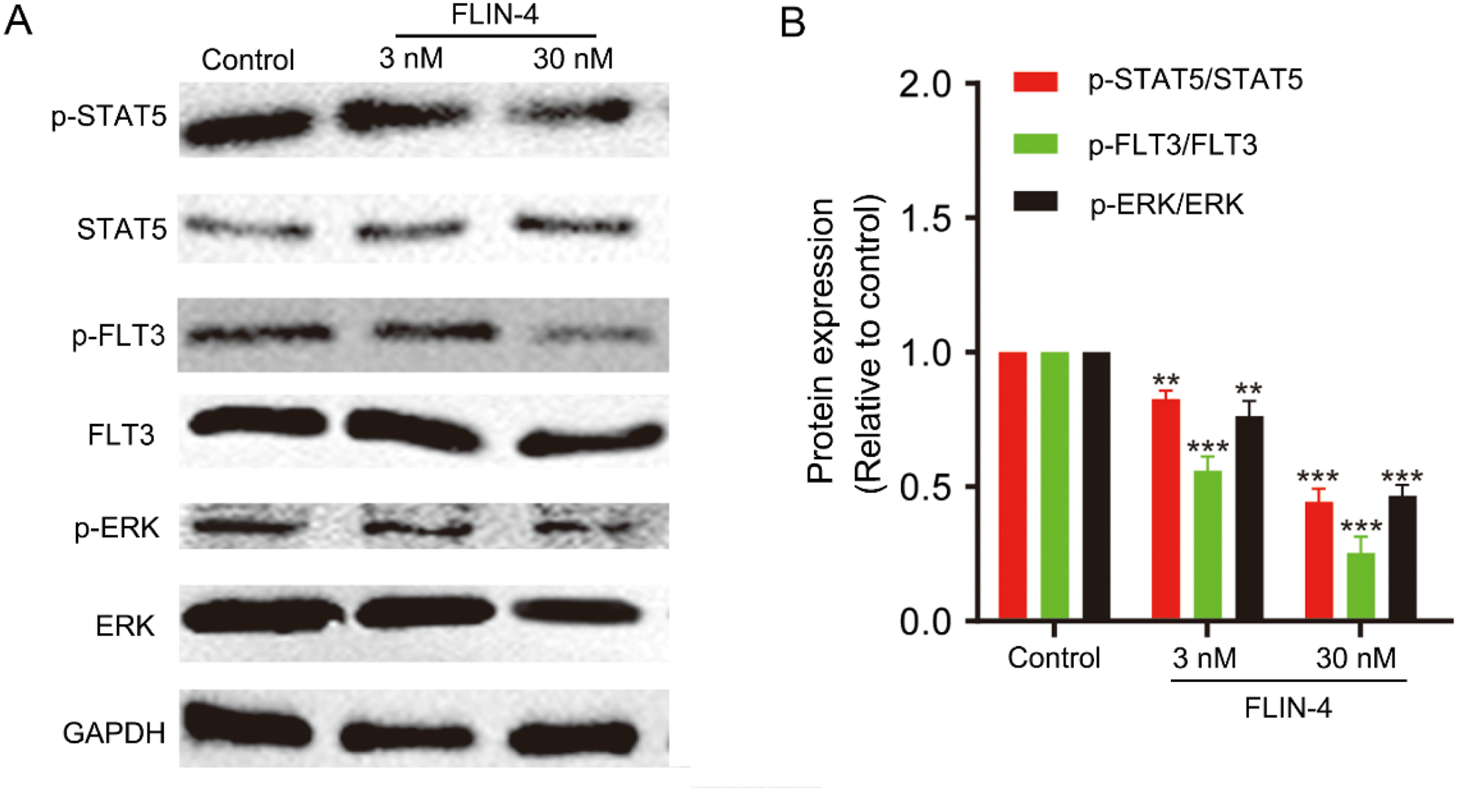 Figure 7. FLIN-4 inhibits FLT3 autophosphorylation and the phosphorylation of downstream signaling effectors in MV4-11 cells. (A) Expression of p-STAT5, STAT5, p-FLT3, FLT3, p-ERK, and ERK in MV4-11 cells treated with different concentrations of FLIN-4 for 4 h. (B) Quantification of the results for p-STAT5/STAT5, p-FLT3/FLT3, and p-ERK/ERK in control group and FLIN-4 treated cells at different concentrations. **p < 0.01, ***p < 0.001 compared to the control group. Results are expressed as mean ± SD, n = 3.