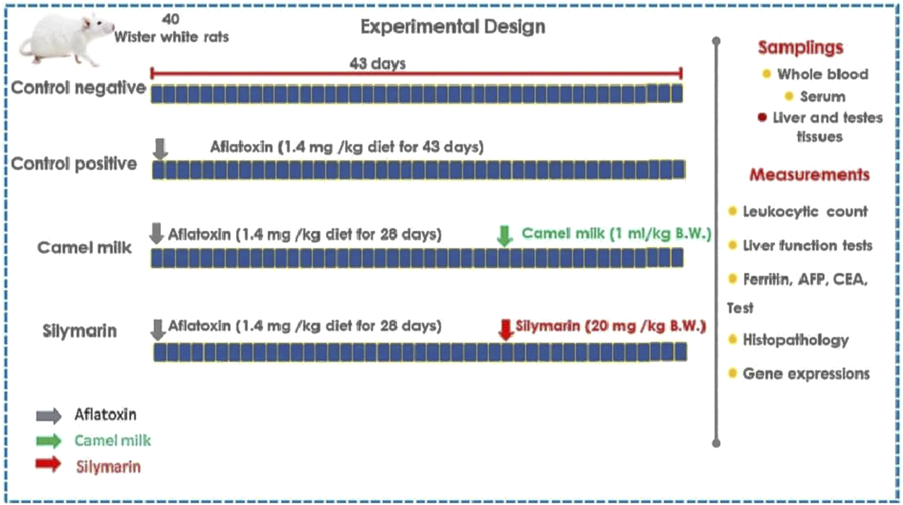 Previous studies (Hassaneen et al., 2023; Hassaneen et al., 2024) have discussed the therapeutic effect of camel milk and silymarin on the harmful effect of aflatoxin in rats from the onset of poisoning. Therefore, this experiment was conducted to evaluate post-treatment with camel milk and silymarin for 14 days on a male rat model exposed to aflatoxin toxicity for 28 days in the diet.