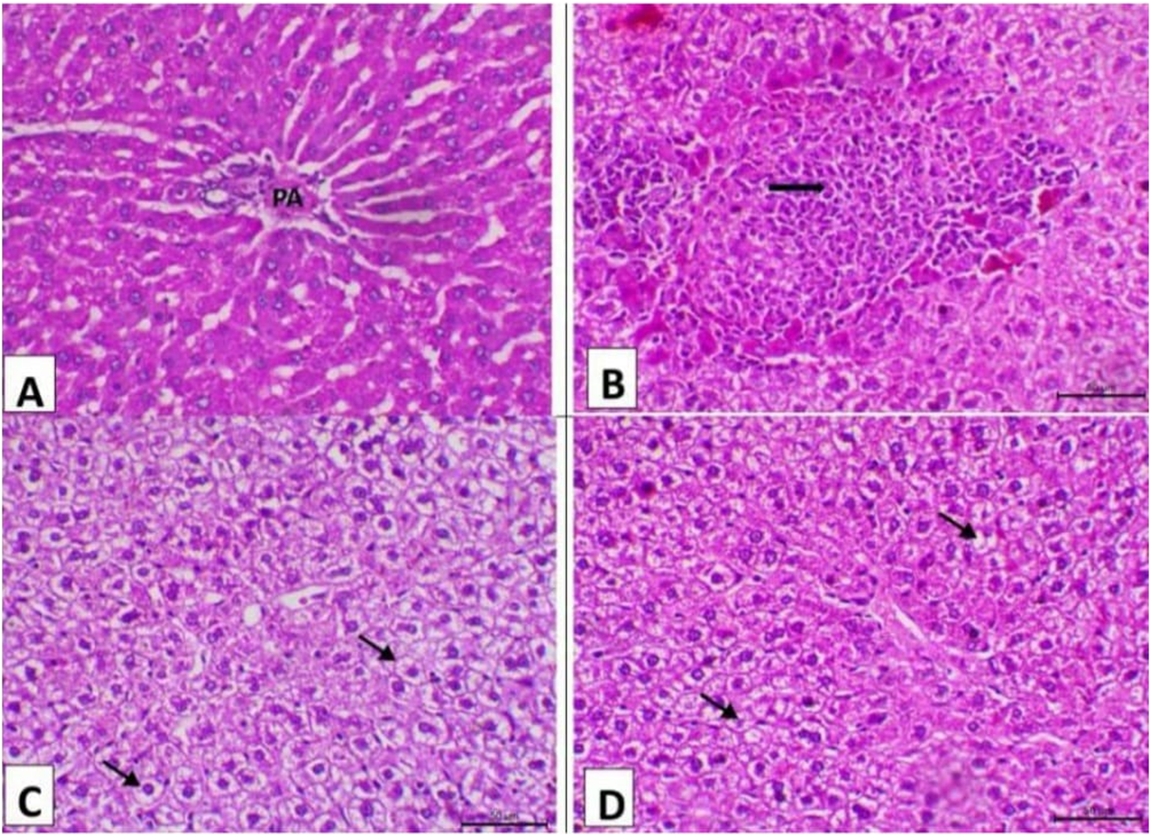 Photomicrograph of the liver (n = 5) of the experimental groups (H&E, X200, Scale bar = 50 μ). (A) Liver of the control negative group showing normal hepatic histology featuring normal hepatocytes arranging in cords and normal portal area (PA). (B) Liver of the control positive group showing marked fibrosis of the portal area and a high level of mononuclear cell infiltration in the portal area. (C) Liver of the camel milk group showing decrease the vacuolar degeneration of the hepatocytes (arrows). (D) Liver of the silymarin group showing marked decrease the vacuolar degenerative changes of the hepatocytes (arrows).