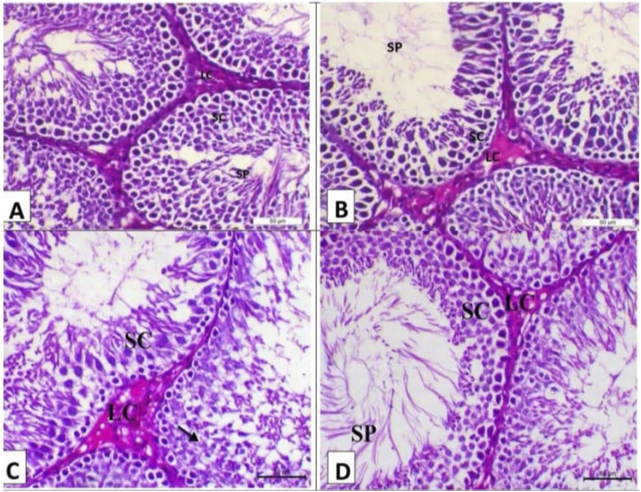 Photomicrograph of the testes (n = 5) of the experimental groups (H&E, X200, Scale bar 50p). (A) Testes of the control negative group showing normal testicular histology with the seminiferous tubule lined with multilayer of spermatogenic cells (SC) and impacted with sperm (arrow) with interstitial Leydig cells (LC). (B) Testes of the control positive group showing arrest of spermatogenesis in some seminiferous tubules with degenerative changes of spermatogenic cells and interstitial edema. (C) Testes of the camel milk group showing decrease in the vacuolar degeneration of the spermatogenic cells (arrows) with decrease in the oedema within the interstitial tissues (SC indicates spermatogenic cells and LC indicates Leydig cells). (D) Testis of the silymarin group showing a marked decrease in the degenerative changes and mostly revealing normal testicular histology as the seminiferous tubule lined with a multilayer of spermatogenic cells (SC) and impacted with sperms (SP) with interstitial Leydig cells (LC).