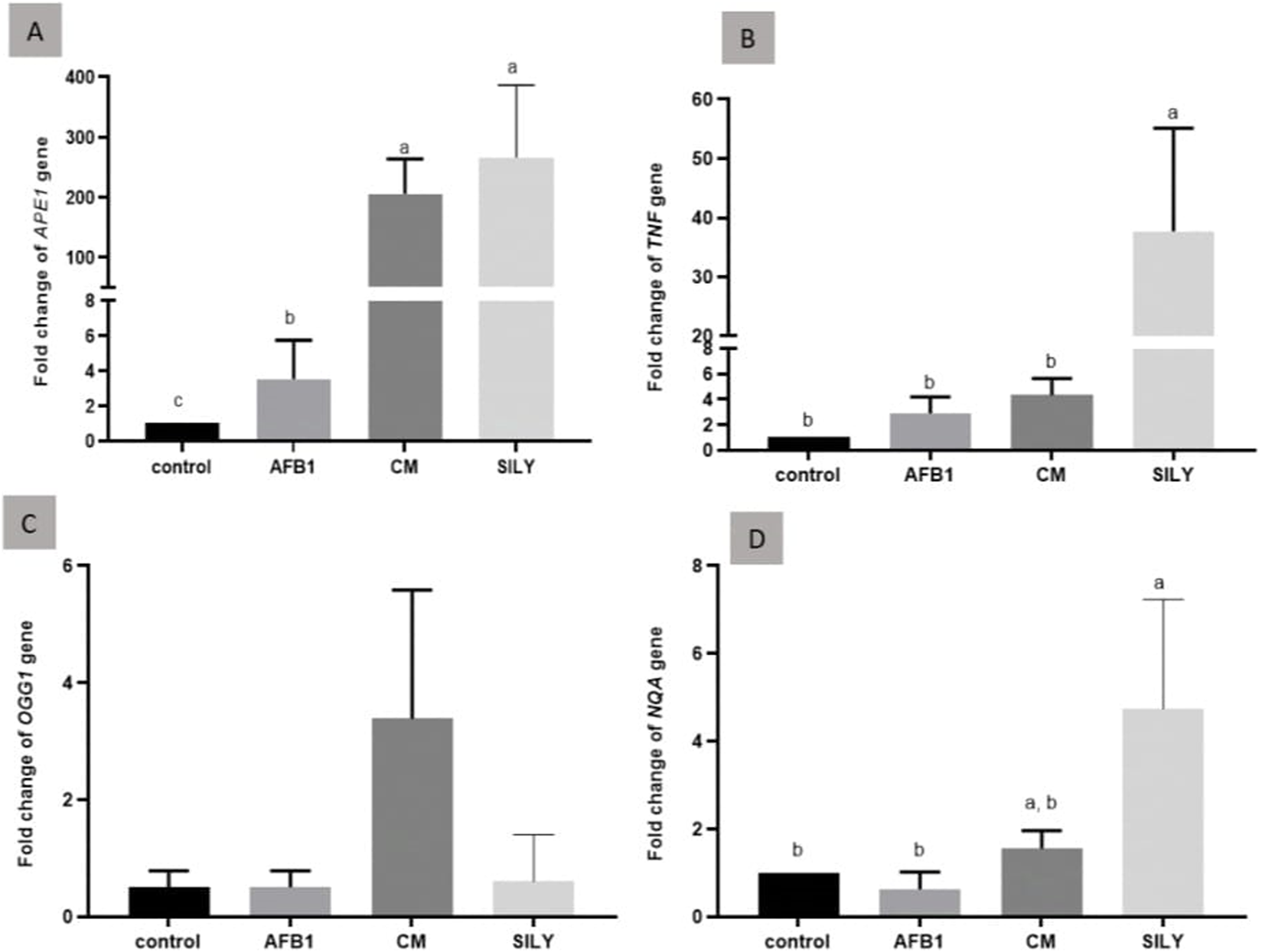 Ameliorative effects of camel milk and silymarin on gene expression in liver tissues. The gene expression (fold change) was calculated relative to the control negative group (calibrator). (A) Fold change of APE1 gene, (B) Fold change of TNFα gene, (C) Fold change of OGG1 gene, and (D) Fold change of NQA gene. AFB: Aflatoxin, CM: camel milk, SILY: Silymarin.