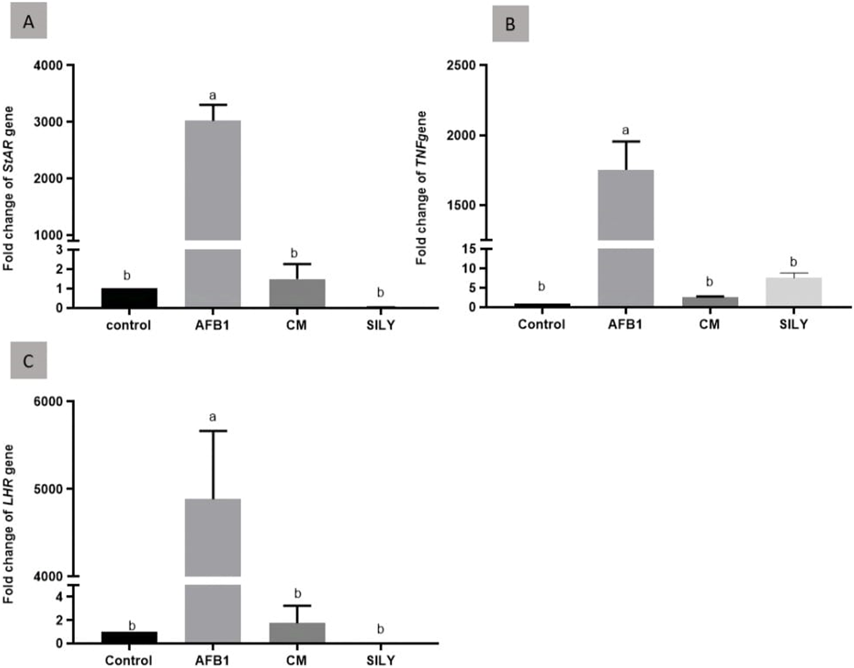 Ameliorative effects of camel milk and silymarin on gene expression in testicular tissues. The gene expression (fold change) was calculated relative to the control negative group (calibrator). (A) Fold change of StAR1 gene, (B) Fold change of TNFα gene, and (C) Fold change of LHR gene. AFB: Aflatoxin, CM: camel milk, SILY: Silymarin.