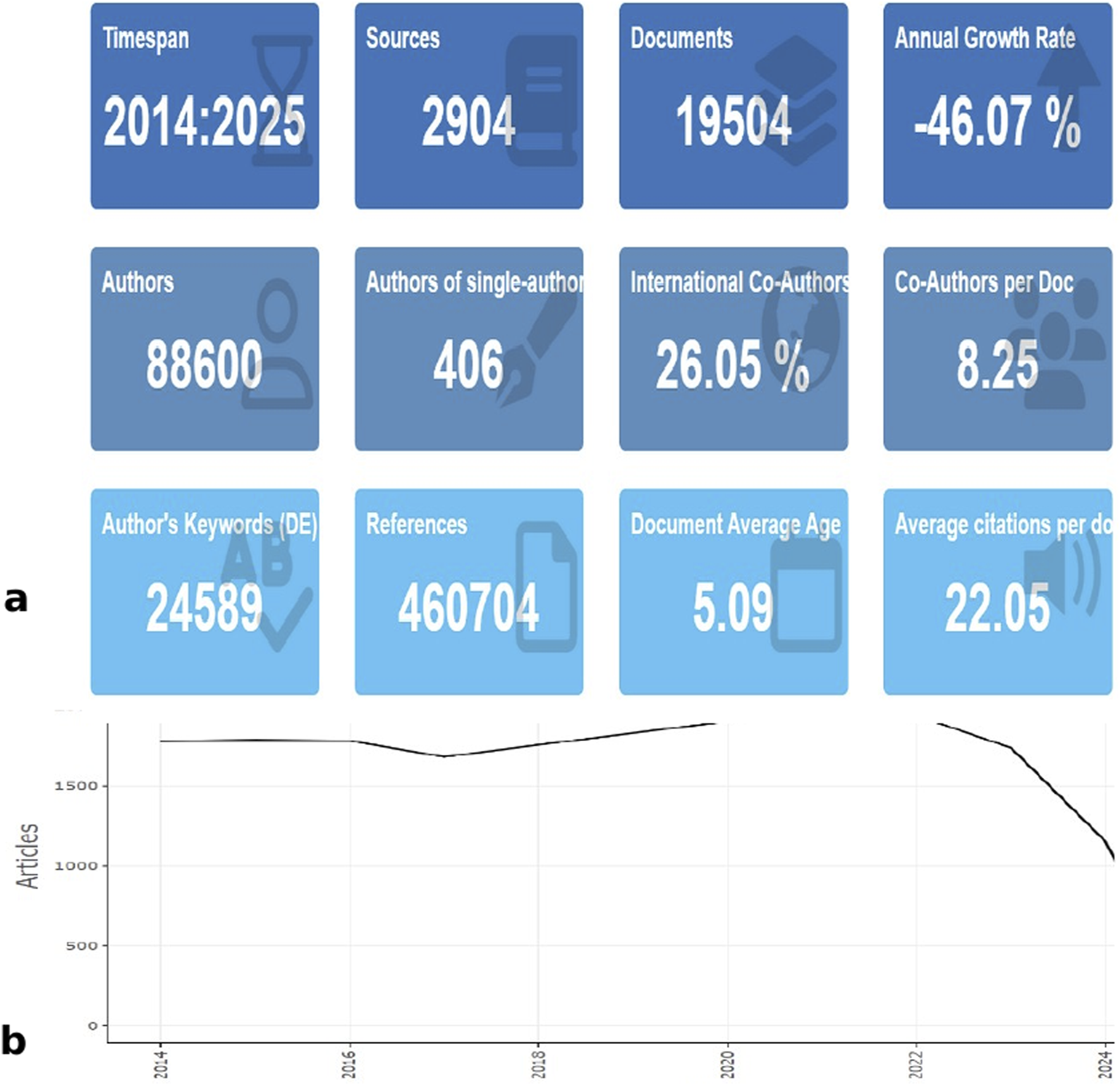 Analysis of annual publications. (a) Main information. (b) Analysis of annual scientific production related to aspirin.