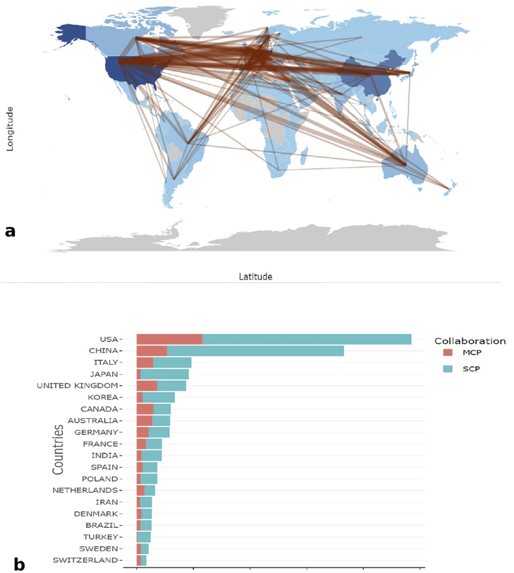 Disrtibution map of countries. (a) The country collabration map. (b) The proportion of SCP and MCP in the top ten countries ranked by publication output. SCP: single country publication. MCP: multiple country publication.
