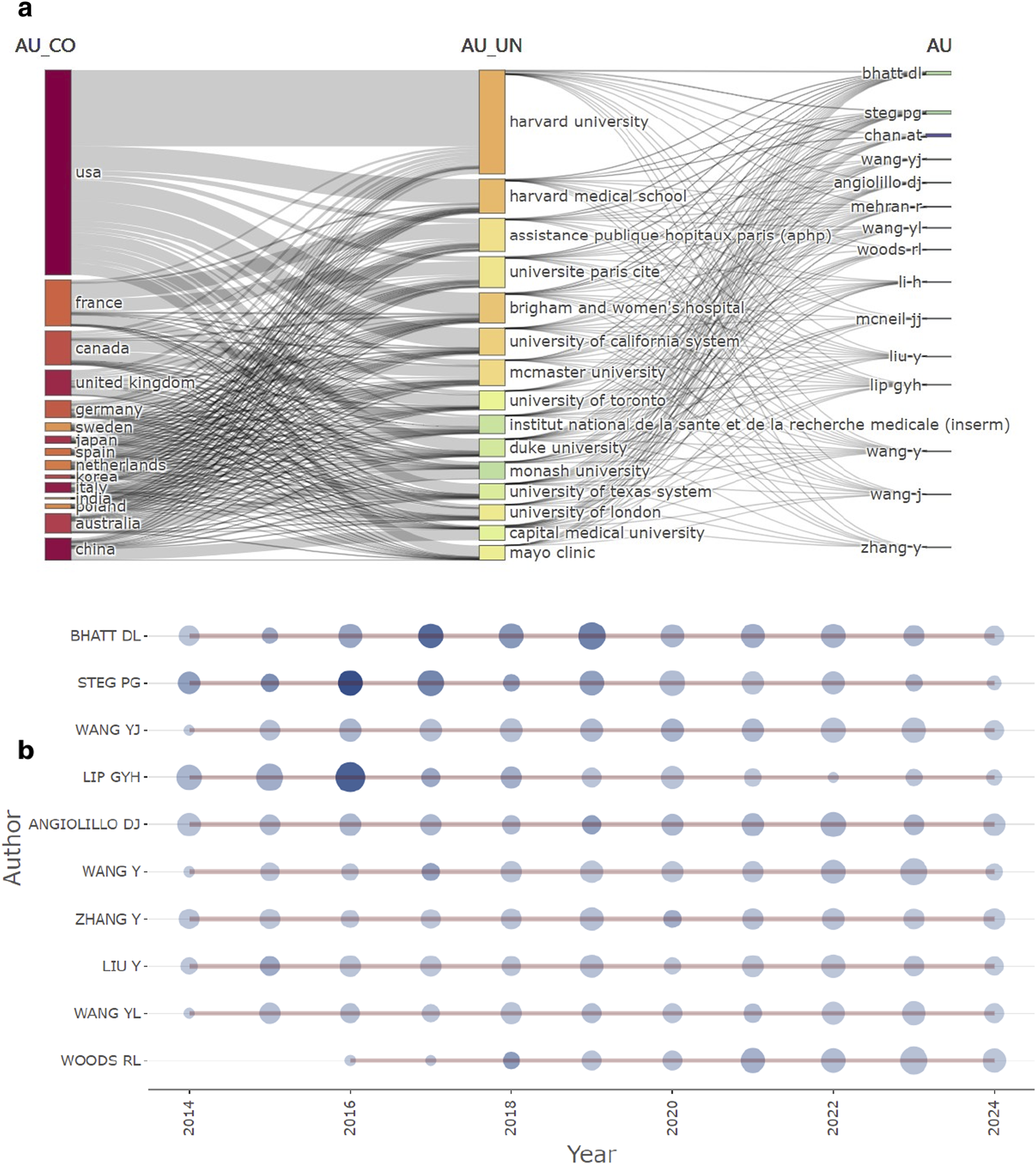 Disrtibution map of authors. (a) Three-field plot-country, institution, authors. (b) Author’s production over time.