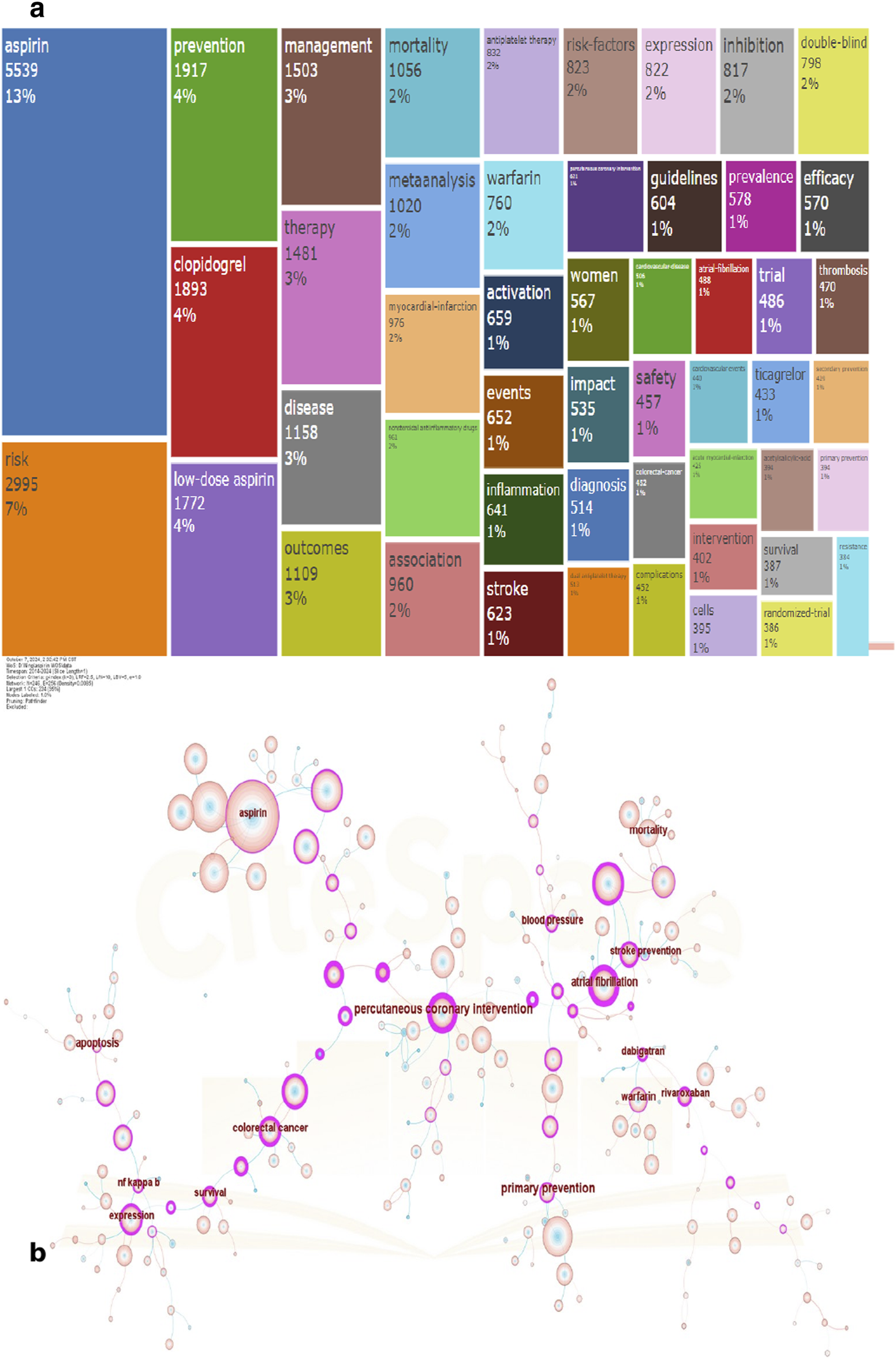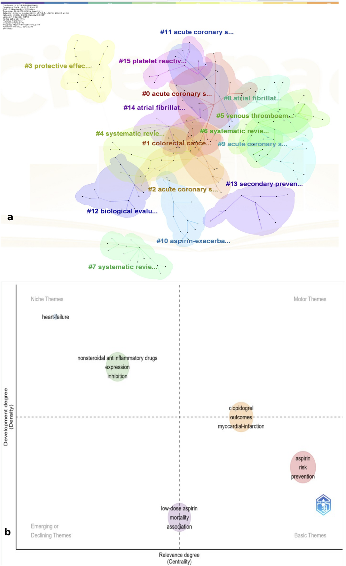 (a) Clusters of keywords related to aspirin. (b) Thematic map of keywords related to aspirin.