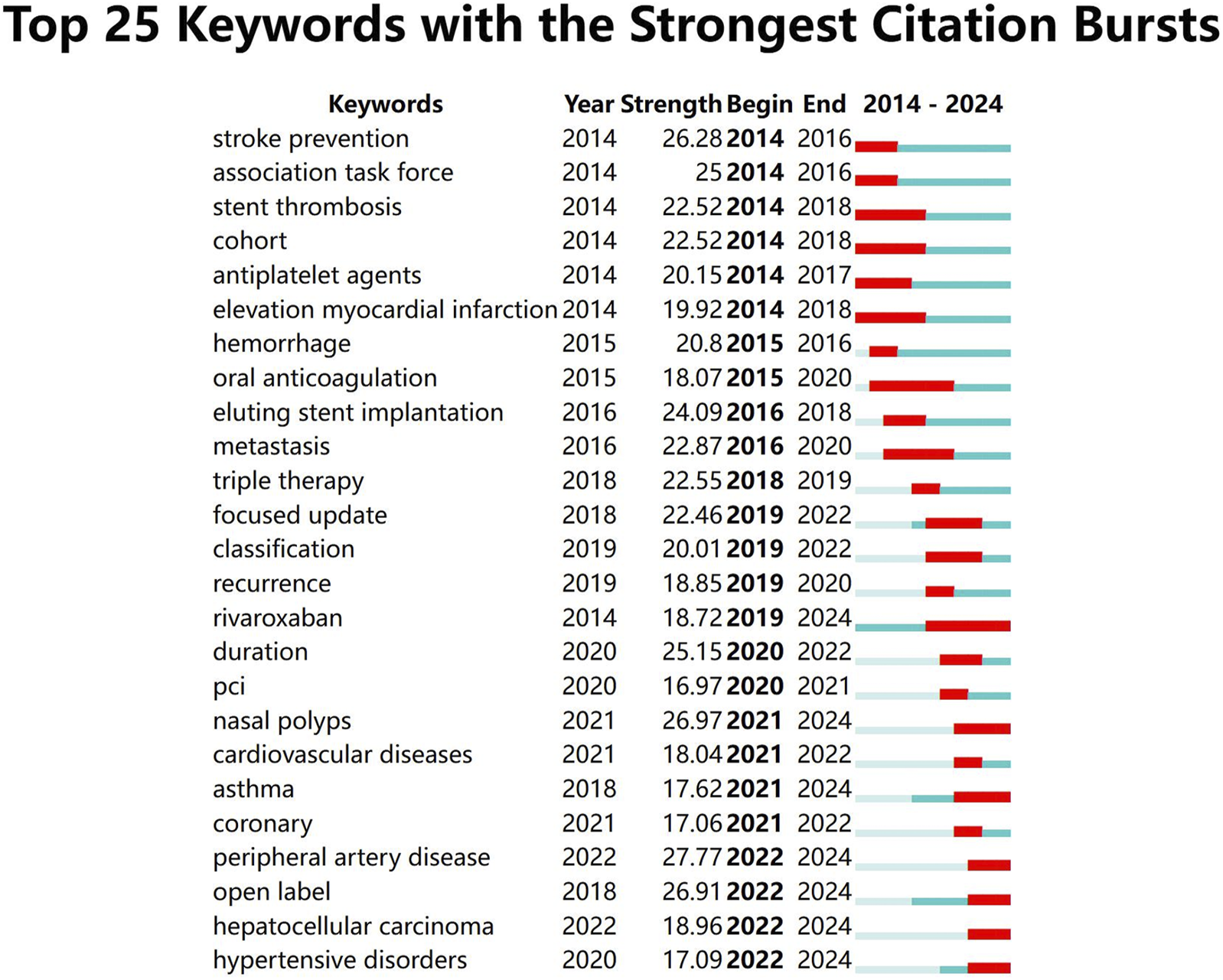 In the keywords with the strongest citation bursts (Figure 7), The blue line denotes the timeline, 红色 this refers to the sudden increase in citations of specific articles within a certain period. This serves to identify the latest high-profile research keywords in the field of aspirin research. All 25 keywords exhibited strength values significantly greater than 2.0, demonstrating statistically significant prominence during this time period.”