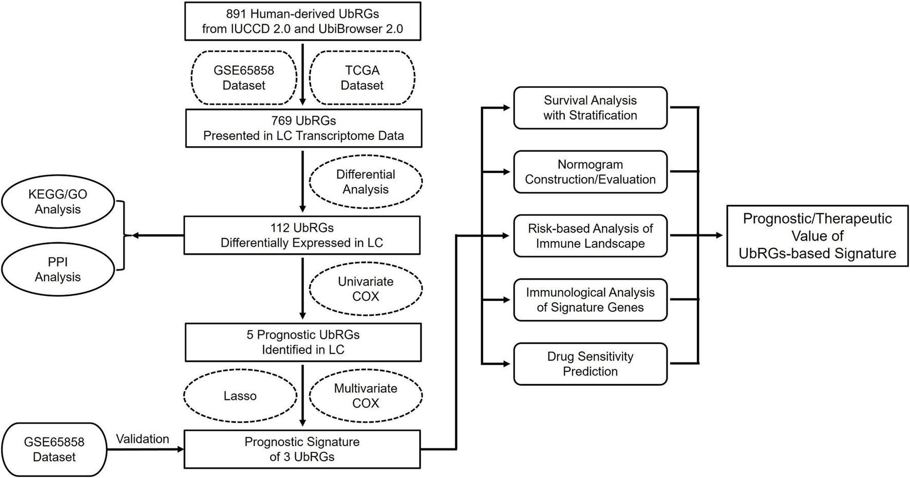 RNA-seq and clinical data of LC were obtained from TCGA and GEO. UbRGs that independently influenced the overall survival (OS) of LC patients were screened with differential expression, COX and LASSO regression analyses. A prognostic signature was then established and assessed for its predictive value, stability and applicability using Kaplan-Meier analysis and receiver operating characteristic curves. The nomogram was further generated in combination with the signature and clinical characteristics. Characterization of immune properties and prediction of drug sensitivity were investigated on the signature-based subgroups using a panel of in silico platforms. Verification of gene expression was conducted with Western blot, qRT-PCR and ELISA, ultimately.