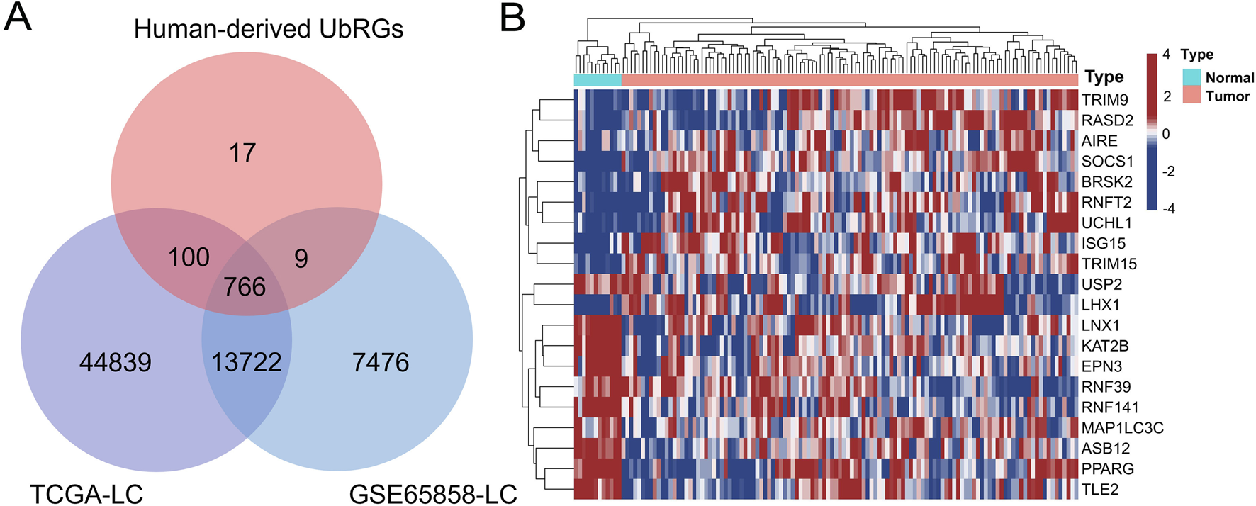Screening of UbRGs differentially expressed in LC. (A) The Venn diagram showed 769 UbRGs retrieved from human-derived databases and presented in the TCGA-LC and GSE65858-LC datasets. (B) The heatmap of the top 20 differentially expressed UbRGs, with both genes and patients clustered.