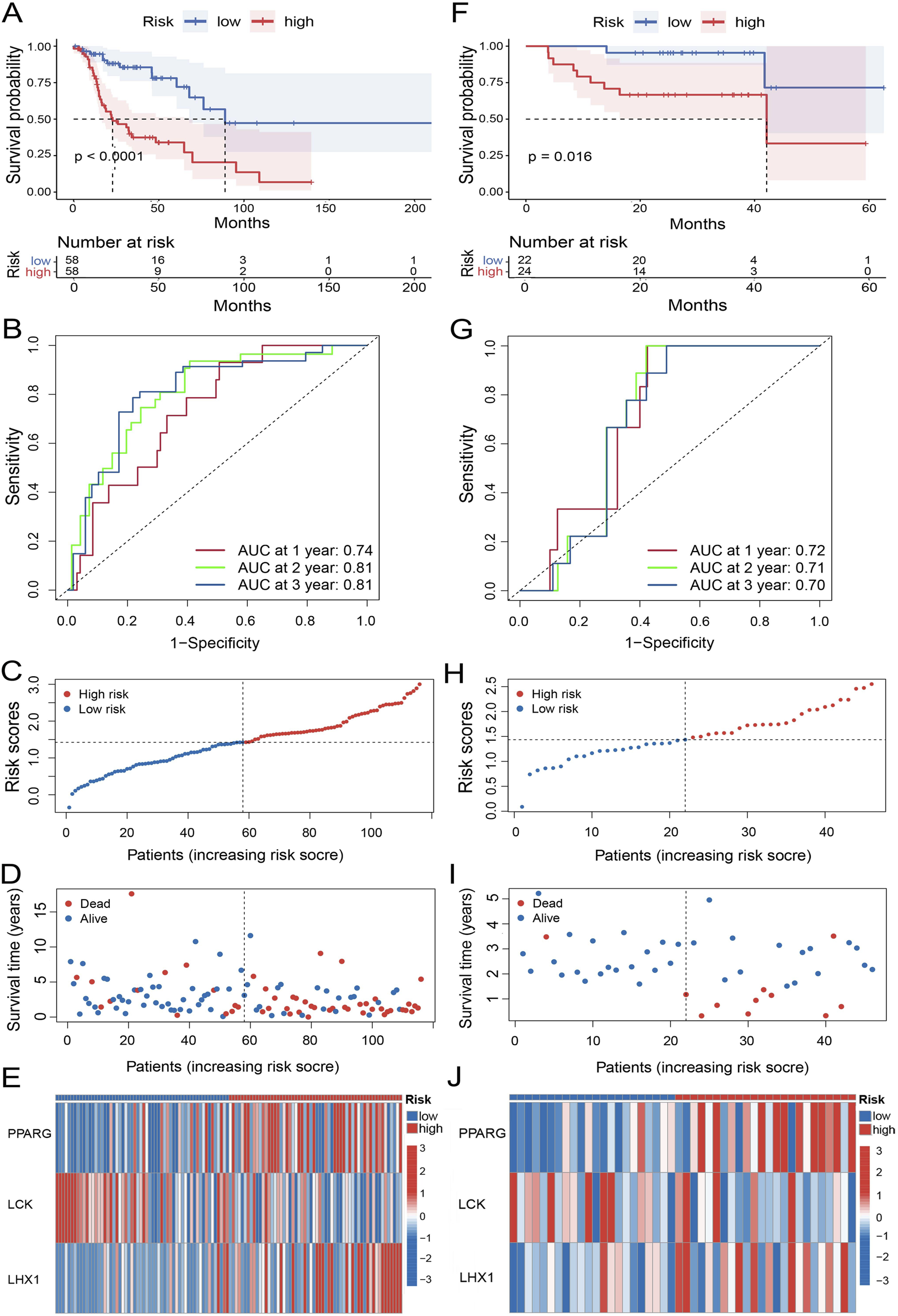 Evaluation of the prognostic performance of the UbRGs-based signature. (A) Kaplan-Meier analysis of OS in the high- and low-risk groups based on the training set. (B) ROC curves showing the predictive efficacy of this signature for 1-, 2-, and 3-year OS of patients in the training set. (C–E) Distribution of characteristics of individual patients in the training set, in-cluding (C) risk score, (D) survival status, and (E) expression profiles of 3 signature genes. (F–J) Evaluation of the UbRGs-based signature with the validation set for (F) Kaplan-Meier analysis of OS, (G) ROC curves of predictive efficacy in 1-, 2-, 3-year OS, and (H) risk score, (I) survival status, and (J) expression profiles of 3 signature genes in individual patients.