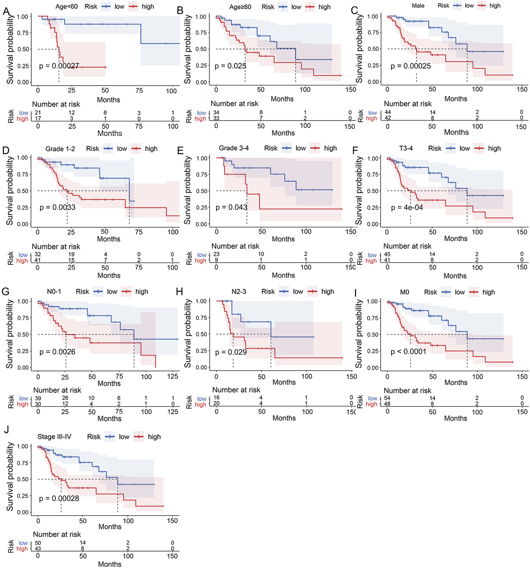 Assessment of the clinical applicability of the UbRGs-based signature. Significant dif-ferences in OS were exhibited between the high- and low-risk groups in conditions of (A) age<60, (B) age≥60, (C) male, (D) Grade 1-2, (E) Grade 3-4, (F) T3-4 stage, (G) N0-1 stage, (H) N2-3 stage, (I) M0 stage and (J) clinical stage III-IV by stratified Kaplan-Meier analysis.
