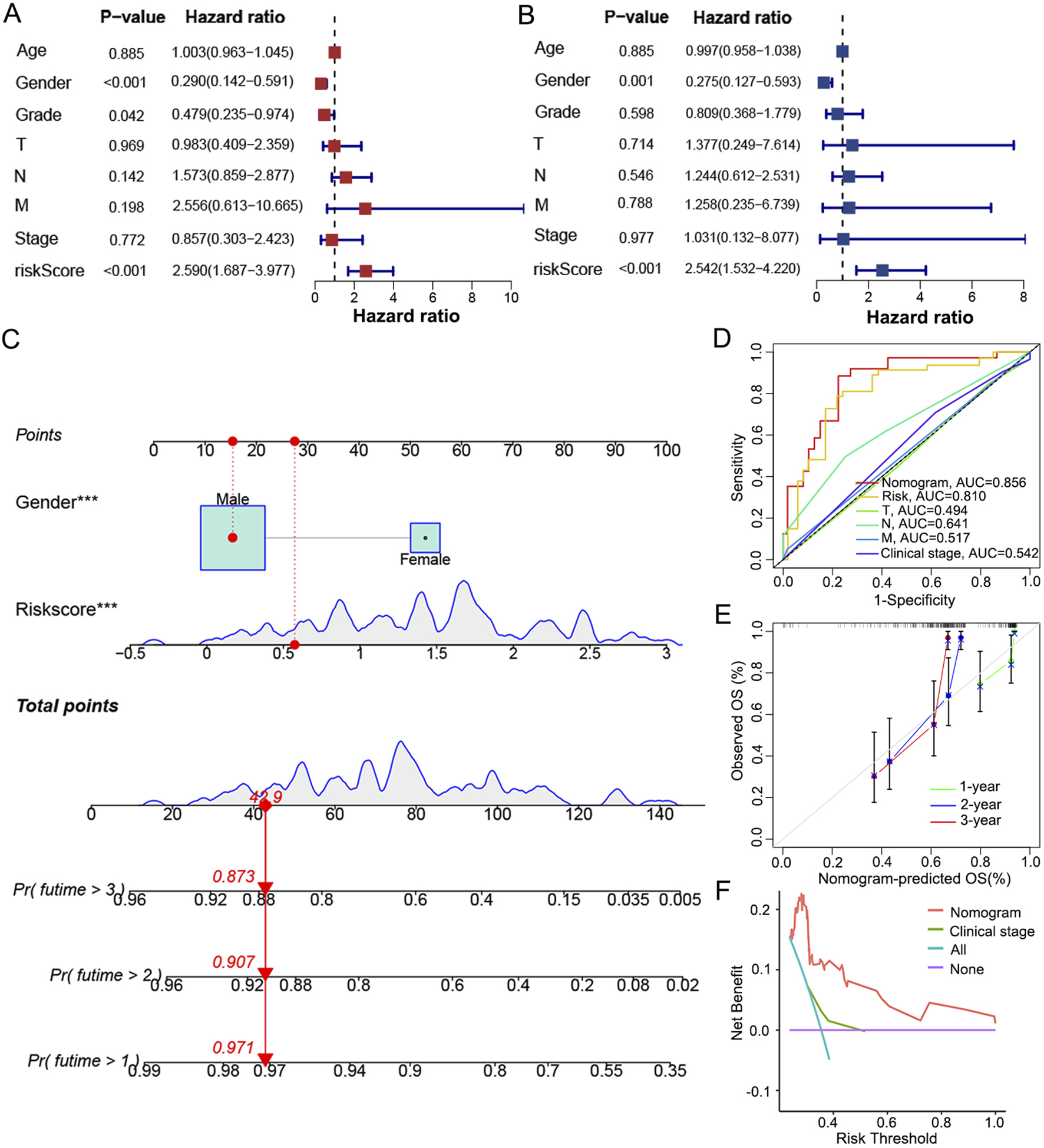 Establishment and evaluation of a nomogram integrating signature with gender. (A) Univariate and (B) multivariate COX regression analysis to highlight independent factors af-fecting OS in LC patients. (C) A nomogram constructed to predict the 1-, 2-, and 3-year OS in LC patients by combining the risk score with gender. (D) ROC curves based on the nomogram, risk score and traditional indicators to show the predictive efficacy of 3-year OS in LC patients. (E) Calibration curves of the consistency between the predicted and actual survival rates at 1, 2 and 3 years. (F) DCA showed the net clinical benefit of the nomogram and traditional stage.
