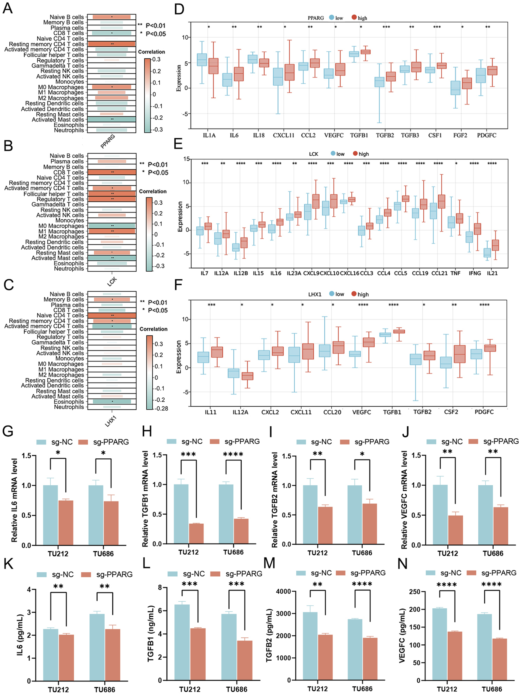 Investigation of the role played by signature genes in sculpting the immune landscape. (A–C) Correlation between immune cell infiltration and expression levels of 3 signature genes, (A) PPARG, (B) LCK and (C) LHX1. (D–F) Relationship between expression levels of immune-related cytokines and 3 signature genes, (D) PPARG, (E) LCK and (F) LHX1. (G–I) Cytokine mRNA levels quantified by qRT-PCR in PPARG knockout cells derived from LC cell lines TU212 and TU686, including (G) IL6, (H) TGFB1, (I) TGFB2 and (J) VEGFC. (K–N) Cytokine secretion levels meas-ured using ELISA in the supernatant of PPARG knockout LC cells, including (K) IL6, (L) TGFB1, (M) TGFB2 and (N) VEGFC. *p < 0.05; **p < 0.01; ***p < 0.001; ****p < 0.0001.