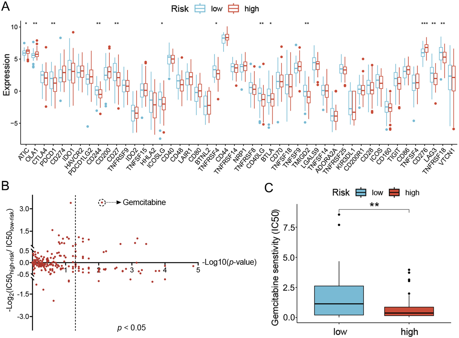 Prediction of sensitivity to clinical treatments for the high- and low-risk groups of LC patients. (A) Immune checkpoints differentially expressed in the high- and low-risk groups. (B) Predicted sensitivity to chemotherapy and targeted agents in the high- and low-risk groups. Data were plotted as -Log10(p-value) on the x-axis and -Log2(IC50high-risk/IC50low-risk) on the y-axis. (C) Predicted IC50 for gemcitabine in both groups. *p < 0.05; **p < 0.01; ***p < 0.001.