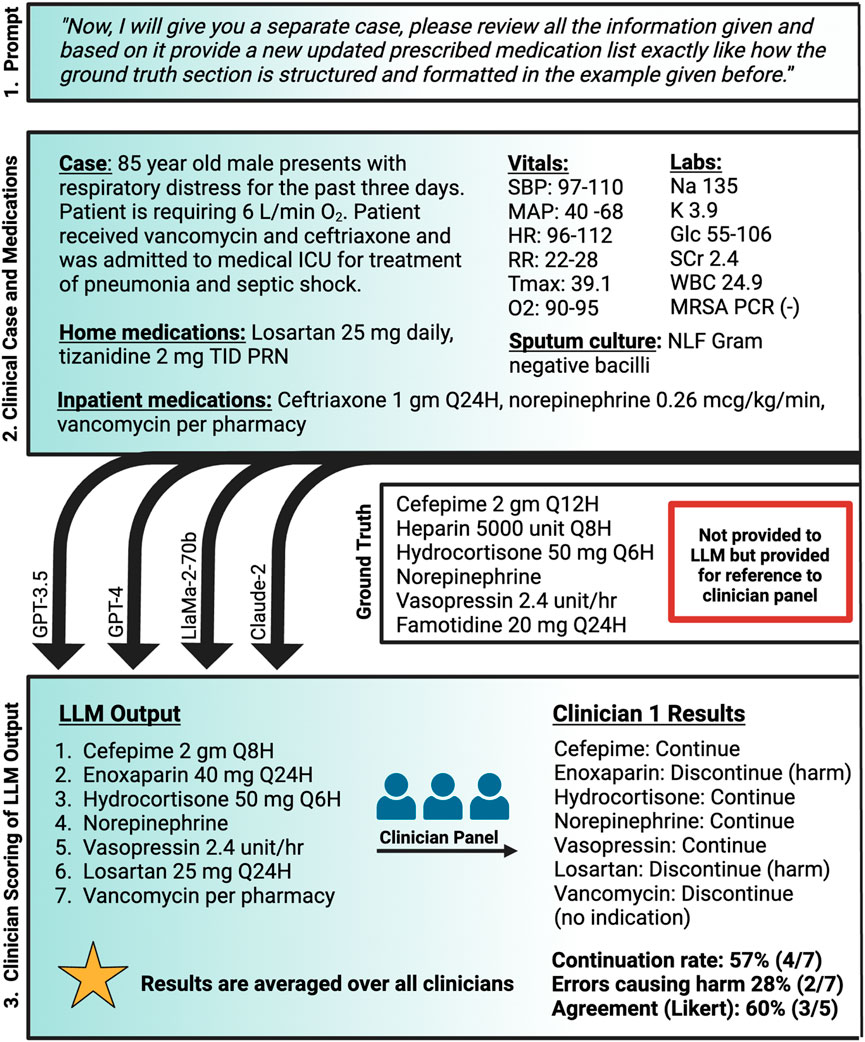 The primary objective was to evaluate the capabilities of LLMs in generating safe and efficacious treatment plans for complex patient cases. This involved a carefully structured prompting process, intended to elicit the most accurate and clinically relevant responses from the LLMs. Our study used a comparative analysis approach, testing four advanced LLMs: GPT-3.5, GPT-4, Llama-2–70b, and Claude-2. These LLMs were chosen to parallel other exploratory analyses by our team and were thought to be representative of LLM capability and functionality (Chase et al., 2025; Yang et al., 2024). Seven distinct patient cases were used in the fall of 2023, with one that served as an initial example for single-shot prompting, and the subsequent seven cases utilized as actual test scenarios. All test scenarios were entered in separate chats. ChatGPT was accessed via the chatbot interface using the standard settings of temperature = 0.7 and Top P = 1.0. Llama-2–70b was also used with the standard settings. The primary outcomes were based on the safety and efficacy of the recommended scenarios, as assessed by a panel of seven critical care clinicians. Safety was measured by the rate of clinician-identified medication errors and life-threatening medication errors recommended by the LLMs. Efficacy was measured by the average rate of clinician continuation of medications recommended by the LLMs. Other outcomes included the overall agreement of clinicians with the recommended regimen based on a five-point Likert scale and characterization of reasons for discontinuation of medications recommended by LLM.