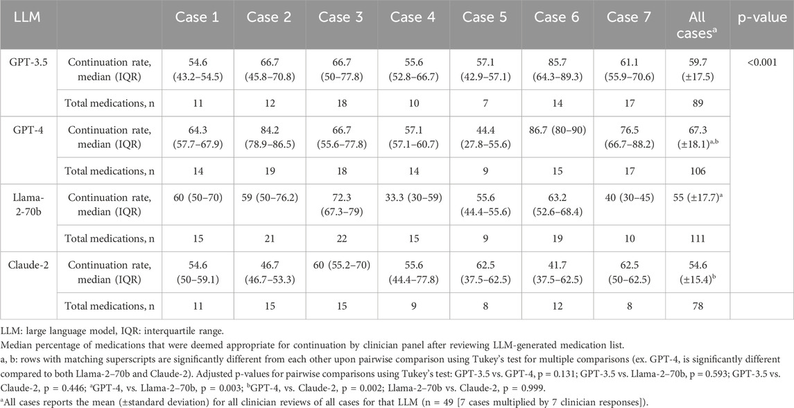 As a measure of efficacy, when clinicians evaluated the LLM-generated medication regimens the median percent of medications continued by each clinician was highest for GPT-4 (67.3% ± 18.1%) followed by GPT-3.5 (59.7% ± 17.5%), Llama-2–70b (55% ± 17.7%), and Claude-2 (54.6% ± 15.4%). Upon post-hoc pairwise analysis, GPT-4 had a significantly higher rate of continuation compared to Llama-2–70b (p = 0.003) or Claude-2 (p = 0.002). These results are summarized in Table 1.