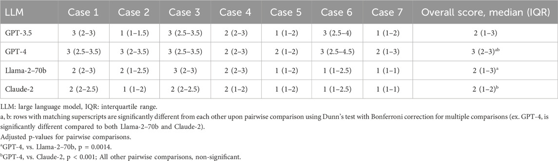 Table 2. Pooled median Likert scores expressing clinician agreement with each LLM-generated medication regimen.