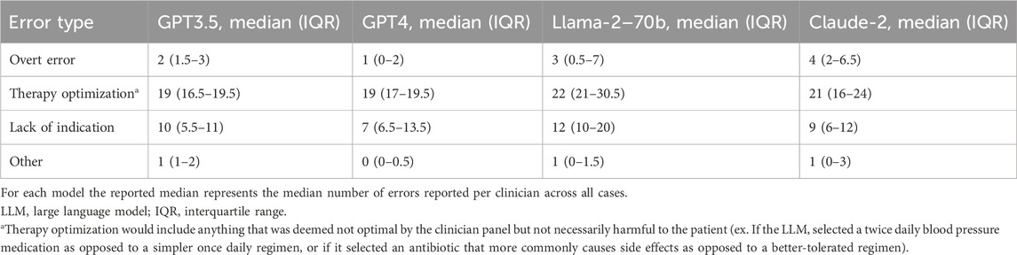 For overall agreement with the LLM-generated regimen, the Likert scores were significantly different among LLMs (χ2 = 15.93, p = 0.001). Post-hoc pairwise comparison showed that GPT-4 had a significantly higher rate of agreement compared to Llama-2–70b or Claude-2 but other comparisons were not different (see Table 2). Table 3 summarizes rationales for clinician discontinuation of medications in the LLM-generated pharmacotherapy regimen. The median number of medication errors identified by the clinician panel in the pharmacotherapy regimens generated by each LLM were 32, 29, 48, and 34 for GPT-3.5, GPT-4, Llama-2–70b, and Claude-2, respectively, with a total of 224, 222, 325, and 246 errors identified in total for each LLM. Therapy optimization was recommended by the clinician panel for 140 medications in the pharmacotherapy regimens generated by GPT-3.5 and GPT-4, 180 medications in Llama-2–70b, and 138 medications in the pharmacotherapy regimen generated by Claude-2. And Claude-2, while optimization was recommended for 147 medications in the pharmacotherapy regimen generated by Llama-2–70b. Lack of indication was identified by the clinician panel for 58 medication recommendations in GPT-3.5, 68 medication recommendations for GPT-4, 104 medication recommendations for Llama-2–70b, and 64 medication recommendations for Claude-2.