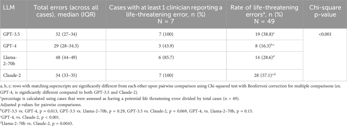As an assessment of safety, the presence of potentially life-threatening recommendations was assessed by clinicians in 57.1% in Claude-2 recommendations followed by 38.8% GPT-3.5 recommendations, 28.6% of Llama-2–70b recommendations, and 16.3% of GPT-4 recommendations. Upon pairwise analysis, GPT-4 had significantly fewer potentially life-threatening errors than GPT-3.5 (p = 0.013) or Claude-2 (p < 0.001) and Llama-2–70b had significantly fewer potentially life-threatening errors than Claude-2 (p = 0.0043) (see Table 4). All other comparisons were non-significantly different. Life-threatening errors per case and a description of those errors are reported in the Supplementary Content- Tables 2, 3.