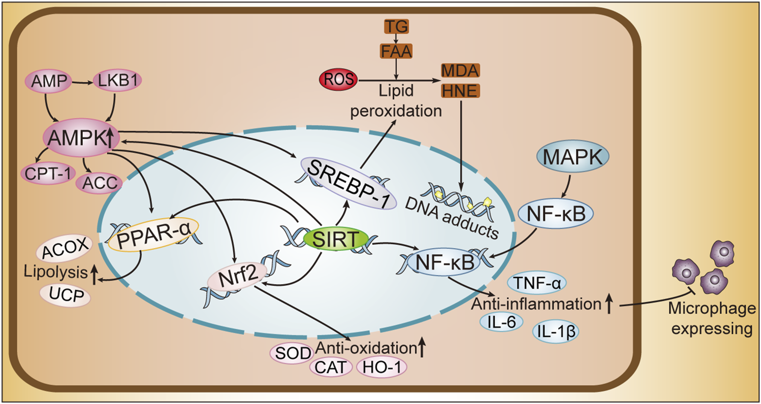| Antioxidation: ↑NAD+ ↑NAD+/NADH; ↓CYP2E1 ↑HO-1; ↓ROS |
