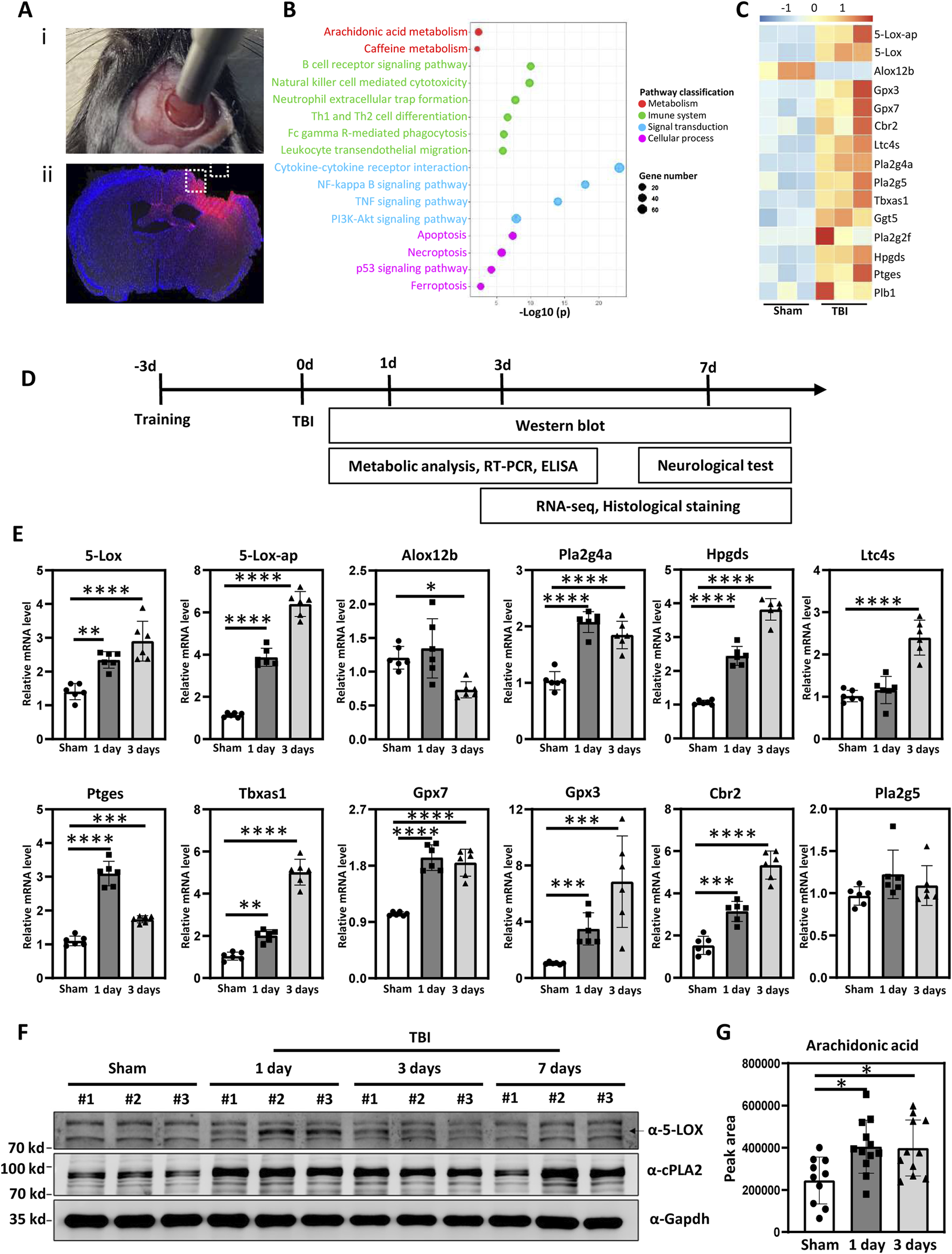 Arachidonic acid (AA) metabolism was upregulated after experimental traumatic brain injury (TBI). [(A)i] The process of controlled cortical impact (CCI) in mice. [(A)ii] Dashed box illustrates the pericontusional region of interest after TBI. (B) Kyoto Encyclopedia of Genes and Genomes (KEGG) pathway enrichment analysis of the genes upregulated after TBI. Significantly enriched metabolic, immune system, signal transduction, and cellular process pathways are shown. (C) Heat map showing differentially-expressed genes related to AA metabolism in the TBI-induced pericontusional brain tissue at 7 days based on RNA-seq analysis (n = 3 for each group). (D) Schematic overview of the experimental design. Mice were subjected to TBI using the CCI model, and the resulting damage phenotypes were analyzed at indicated time points post-injury. (E) mRNA levels of 5-Lox, 5-Lox-ap, Gpx3, Gpx7, Cbr2, Pla2g4a, Ltc4s, Tbxas1, Hpgds, and Ptges were measured in sham and TBI mice at 1 and 3 days after TBI (n = 6 for each group, *p < 0.05, **p < 0.01, ***p < 0.001, ****p < 0.0001). (F) Time course of 5-LOX and Pla2g4a/cPLA2 protein expression in pericontusional tissue. (G) AA concentrations in brain tissue were measured in sham and TBI mice at 1 and 3 days after TBI (n = 10, = 12, and = 11 for the sham, 1-day, and 3-day groups, respectively, *p < 0.05).