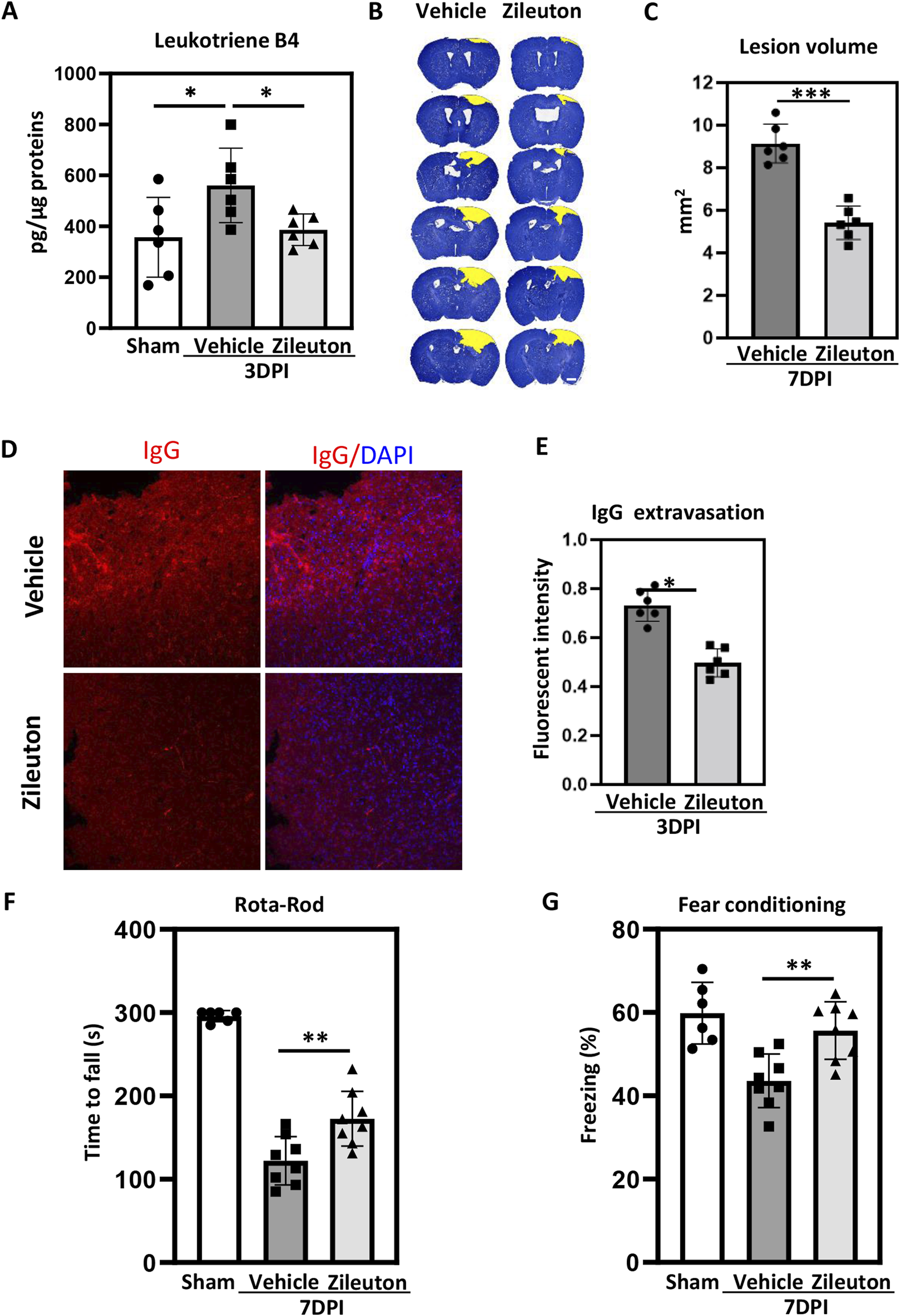 To explore the effects of 5-LOX inhibition on TBI-induced neurological deficits, the rotarod and fear conditioning tests were conducted in both vehicle- and zileuton-treated mice. Compared to the vehicle group, the zileuton-treated group exhibited significant improvements in motor function at 7 days after TBI (p < 0.05; Figure 3F). Similarly, the fear conditioning test revealed significant enhancement in memory function in the zileuton treatment group at 7 days post-TBI compared to the vehicle group (p < 0.05; Figure 3G). Taken together, these results demonstrated that 5-LOX inhibition with zileuton ameliorates TBI-induced brain damage and neurological deficits.
