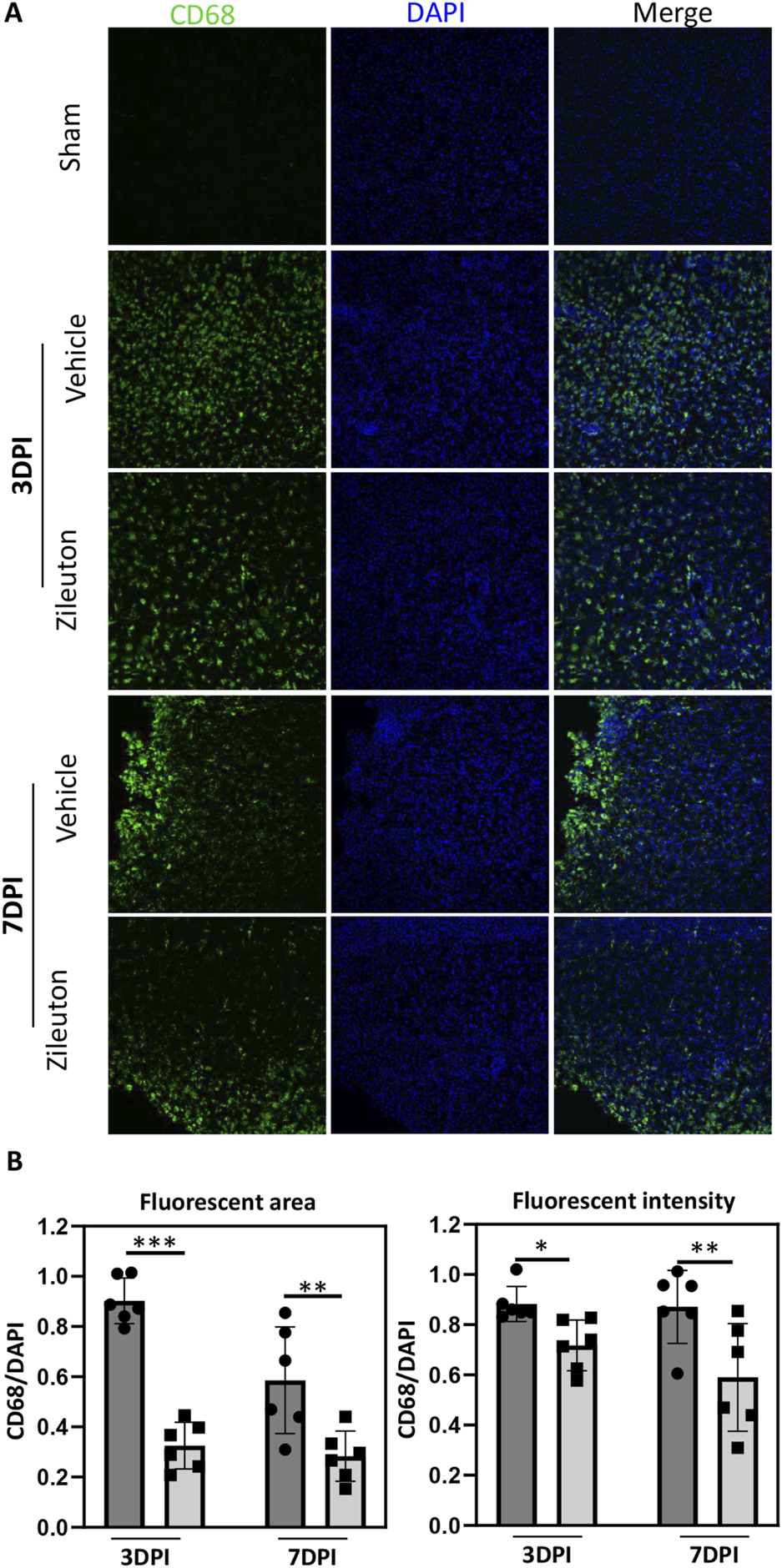 Zileuton reduced TBI induced microglia/macrophage activation. (A) Immunofluorescence staining for CD68 in the pericontusional regions of TBI and zileuton-treated mice at 3 and 7 days after TBI (Scale bar = 10 μm). (B) Quantification of CD68 fluorescence area and intensity relative to 4′6-diamidino-2-phenylindole (DAPI, n = 6 for each group, *p < 0.05).