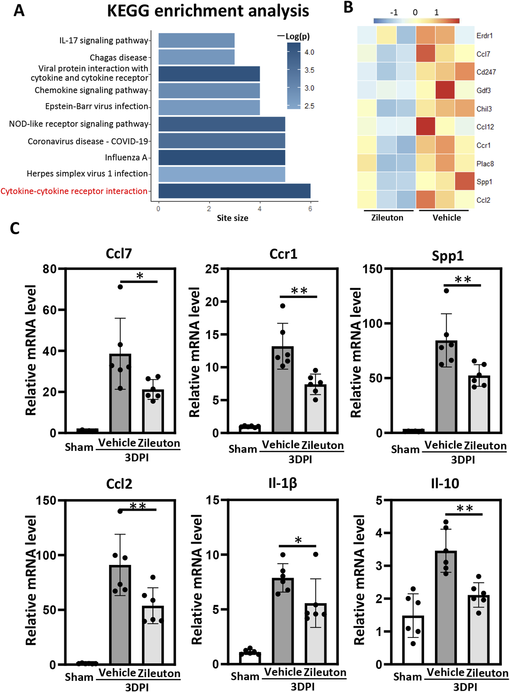 (A) Kyoto Encyclopedia of Genes and Genomes (KEGG) pathway enrichment analysis of the genes downregulated by zileuton treatment. The top most 10 significantly enriched pathways (p < 0.05 by Fisher’s exact test) are shown. (B) Heat map showing differentially expressed genes in the pericontusional brain tissue between the vehicle- and zileuton-treated groups at 7 days after TBI based on RNA-seq analysis (n = 3 for each group). (C) mRNA levels of ccl7, ccr1, ssp1, ccl2, il1β, and il10 were measured in the vehicle- and zileuton-treated mice at 3 days after TBI (n = 6 for each group, *p < 0.05, **p < 0.01).