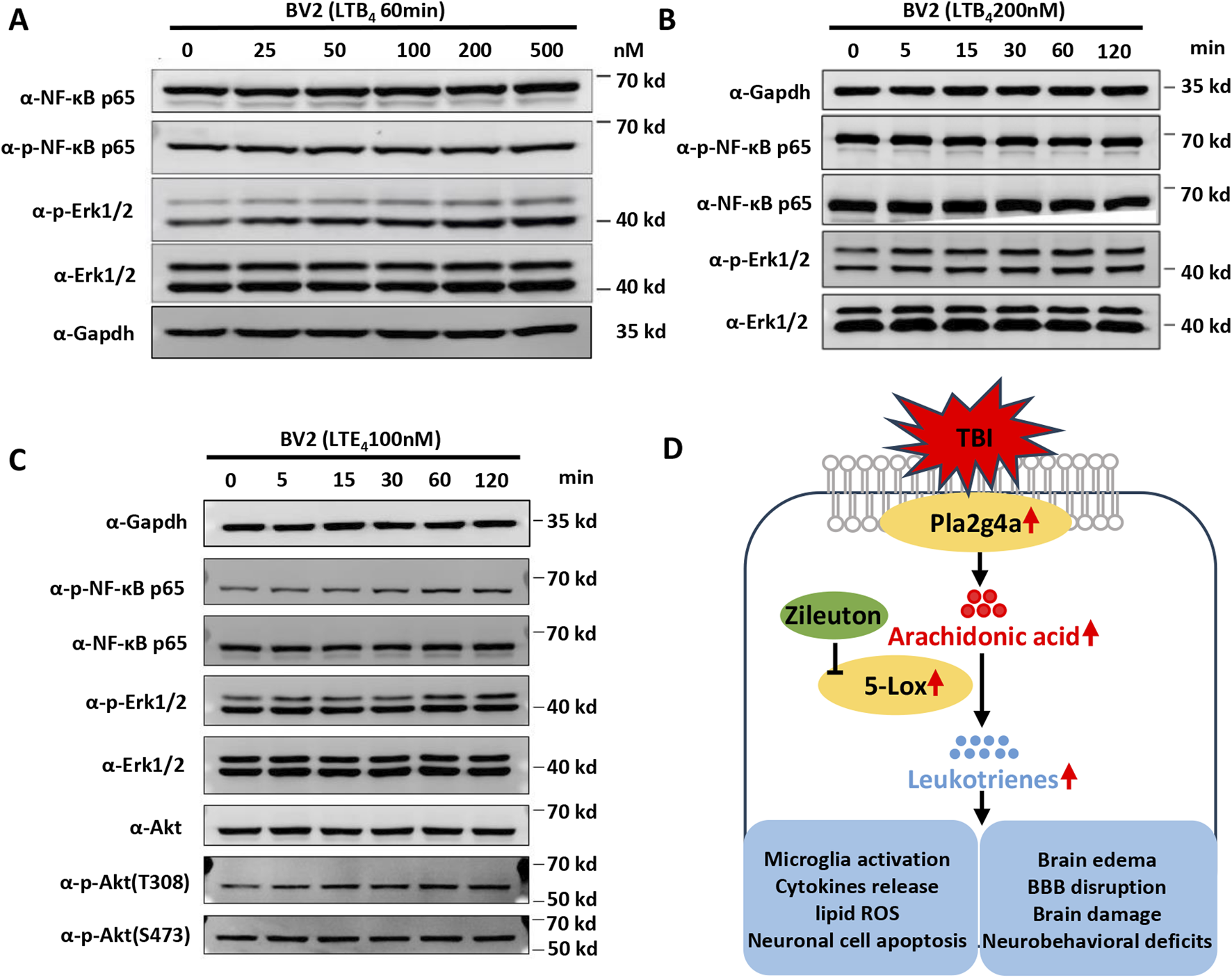 Leukotrienes (LTs) induced inflammatory pathway activation in BV2 microglial cells. (A) Representative dose-dependent and (B) time-dependent Western blot results for NF-κB p65, phospho-NF-κB p65, phospho-Erk1/2, and Erk1/2 expression in LTB4-treated BV2. (C) Representative Western blot results for NF-κB p65, phospho-NF-κB p65, phospho-Erk1/2, Erk1/2 Akt, phospho-Akt at T308, and phospho-Akt at S473 in LTE4-treated BV2. (D) Proposed model of the suppression of TBI-induced microglial activation, cytokine release, brain damage, and neurobehavioral deficits by zileuton through the inhibition of LT release.