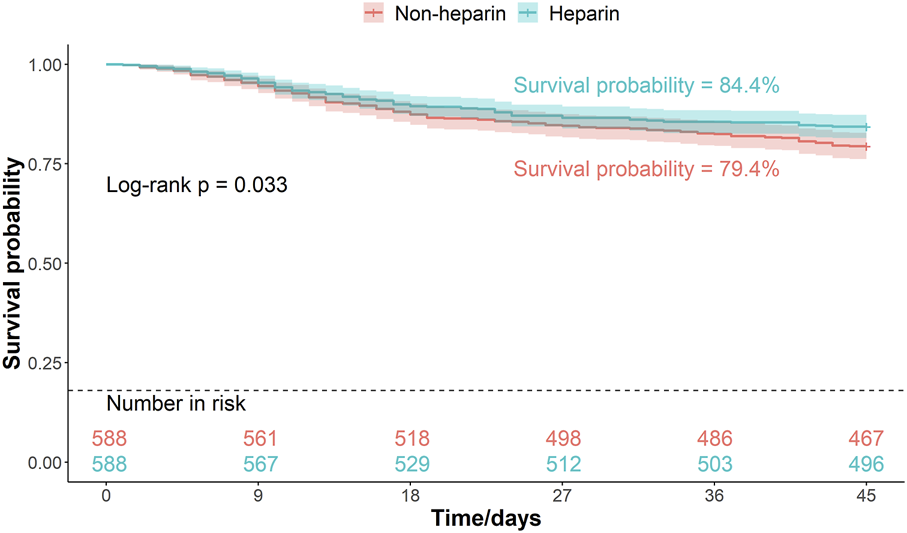 Pneumonia-induced sepsis arises from an imbalance between pathogenic organisms in the lower respiratory tract and both local and systemic immune defenses (Torres et al., 2021). It can lead to severe complications, such as acute kidney injury (AKI) and DIC, significantly increasing patient mortality (Kim et al., 2013). However, the efficacy and safety of heparin in pneumonia-related sepsis remain controversial. To evaluate the impact of heparin use in these patients, we utilized the Medical Information Mart for Intensive Care IV (MIMIC-IV) database, excluding conditions with significant prognostic impact that require anticoagulation. Our goal was to determine whether heparin administration following ICU admission is associated with reduced near-term mortality in patients with pneumonia-induced sepsis.