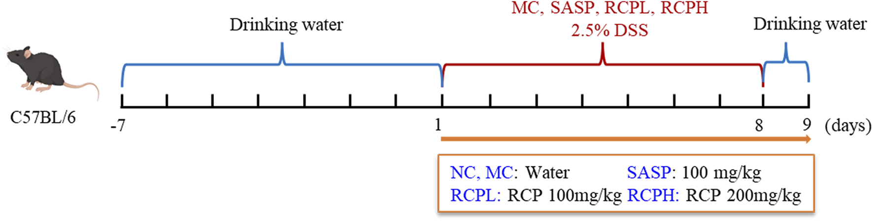 After a 7-day acclimation period, the mice were randomly allocated to five groups: normal control (NC), model control (MC), salicylazosulfapyridine (SASP), low-dose RCP (RCPL), and high-dose RCP (RCPH), with 10 animals per group. While the NC group received regular water, the other groups were given 2.5% DSS in their drinking water for 7 days to induce an UC model, with the DSS solution replaced on days first, third, and fifth. As shown in Figure 1, during the modeling process, medication was administered simultaneously. The RCPL and RCPH groups received RCP doses of 100 mg/kg and 200 mg/kg, respectively, while the SASP group was given 100 mg/kg. The NC and MC groups were given pure water. All treatments were administered via gastric lavage for 8 days.