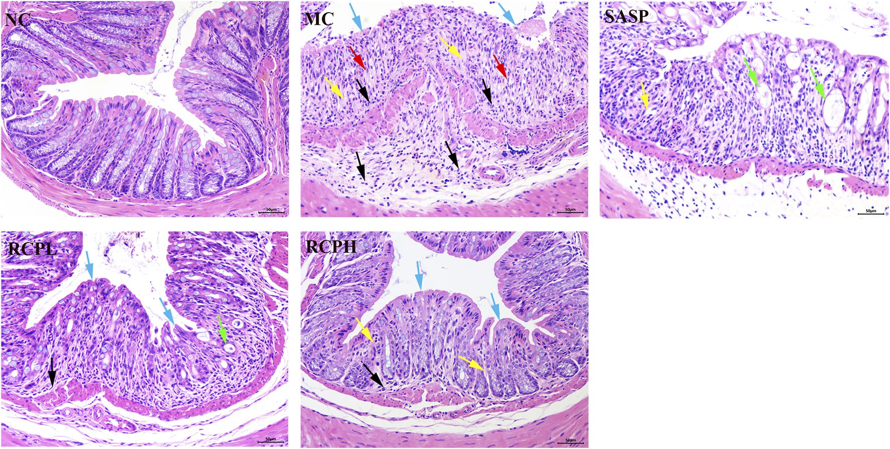 HE staining results of the colon are shown in Figure 4. In the NC group, the mice had an intact intestinal mucosal layer, abundant intestinal glands with compact arrangement, normal morphology of epithelial cells, abundant goblet cells, normal morphology of the muscle layer, and no obvious tissue abnormalities. In the MC group, the mice showed colonic mucosal epithelial necrosis (blue arrows), crypts forming ulcers (yellow arrows), goblet cell reduction and replacement with proliferation of connective tissue (red arrows), more inflammatory cell infiltration (black arrows). In the SASP mice, small-scale crypt loss (yellow arrows), intestinal dilation, and glandular epithelium thinning were observed (green arrow). In the RCPL group, the lesions were significantly reduced compared with the MC group. The colonic mucosal epithelial integrity of the mice was relatively intact (blue arrows), inflammation was reduced (black arrow), and a small number of intestinal gland cavities were slightly dilated (green arrow). In the RCPH group, the mice exhibited intact mucosa (blue arrows), mild inflammation (black arrow), and restored crypt structure (yellow arrows), the lesions were significantly reduced compared with the MC group.