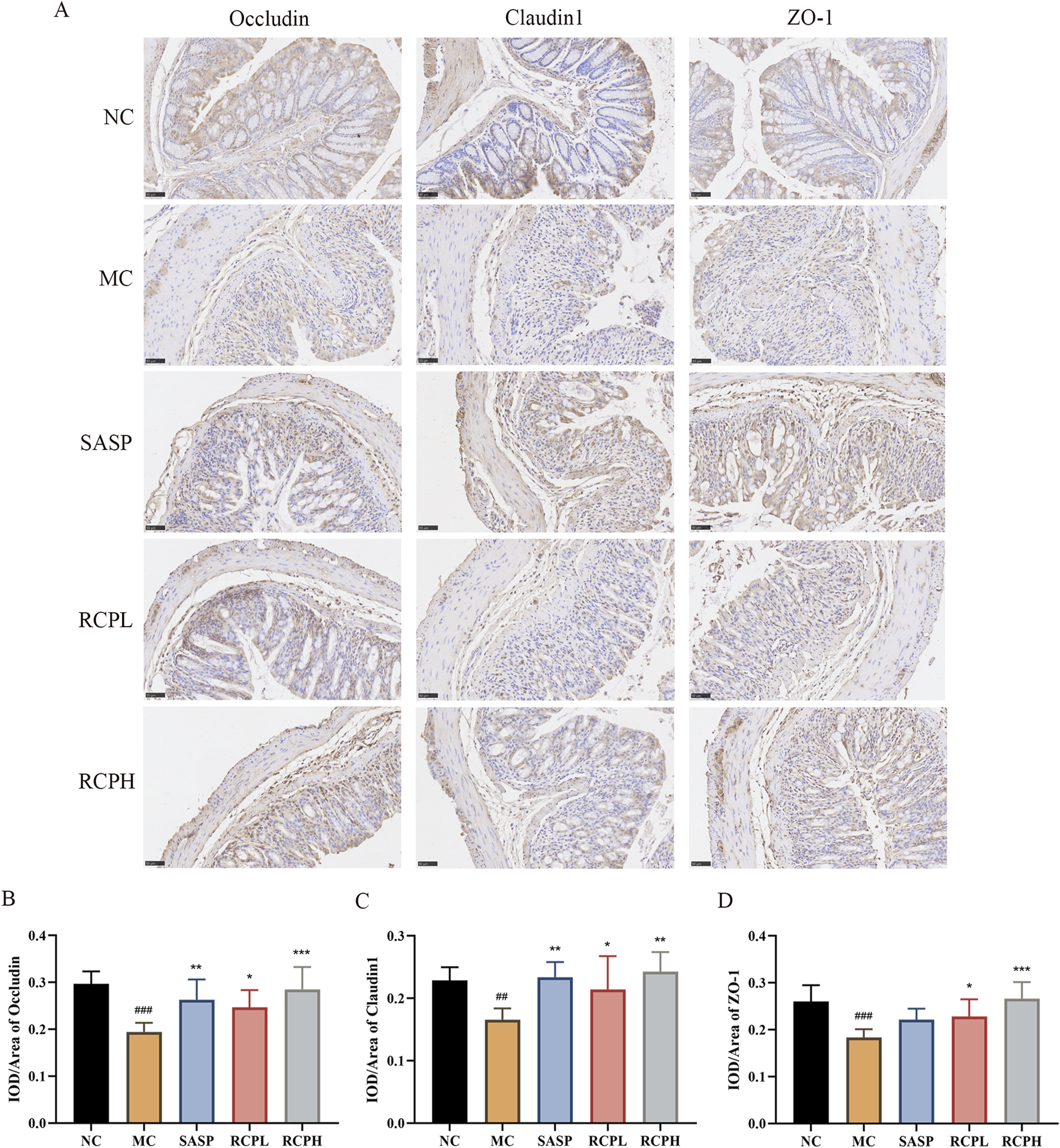 Impact of RCP on TJ protein levels. (A) Immunohistochemical staining of TJ proteins in colonic tissue (400×). (B–D) TJ proteins immunohistochemical analysis. ##p < 0.01, ###p < 0.001 versus NC group, and *p < 0.05, **p < 0.01, ***p < 0.001 versus MC group.