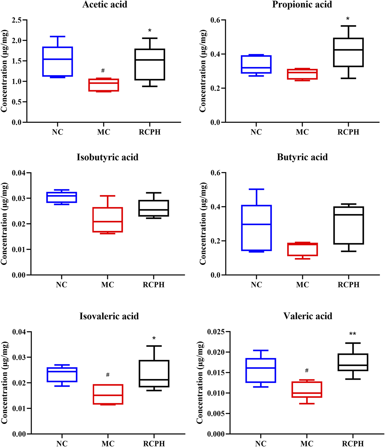 Effect of RCPH on SCFAs content of DSS-induced colitis in mice, including acetic acid, propionic acid, isobutyric acid, butyric acid, isovaleric acid and valeric acid. Data (n = 6 per group) are expressed as median (IQR); #p < 0.05, ##p < 0.01 versus NC group; *p < 0.05, **p < 0.01 versus MC group.