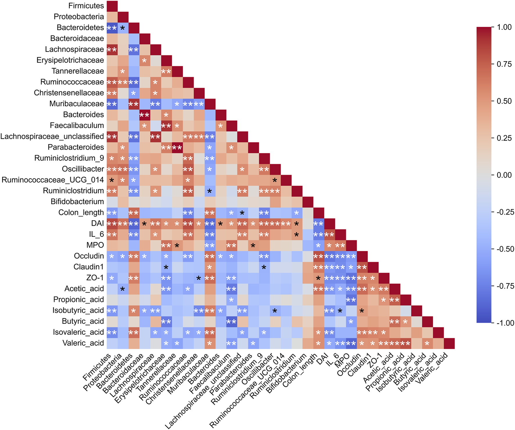 Spearman correlation analysis among gut microbiota, inflammation, tight junction proteins, and SCFAs. *p < 0.05, **p < 0.01.