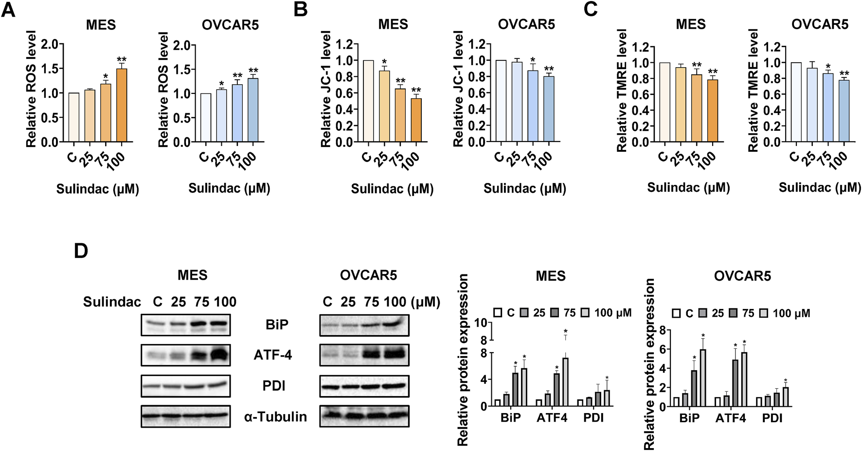 Figure 3. Sulindac induced cellular stress in OC cells. Sulindac significantly increased ROS levels in the MES and OVCAR5 cells after 8 h of treatment (A). The JC-1 and TMRE assays demonstrated that sulindac decreased mitochondria membrane potential in the MES and OVCAR5 cells (B,C). Western blotting results showed that sulindac increased expression of cell stress-related proteins such as BiP, ATF-4, and PDI in both cell lines after 8 h of treatment (D). Data are presented as mean ± SD from three independent experiments. Statistical analysis was performed using one-way ANOVA with Tukey’s post hoc test. *p < 0.05, **p < 0.01 compared with control.