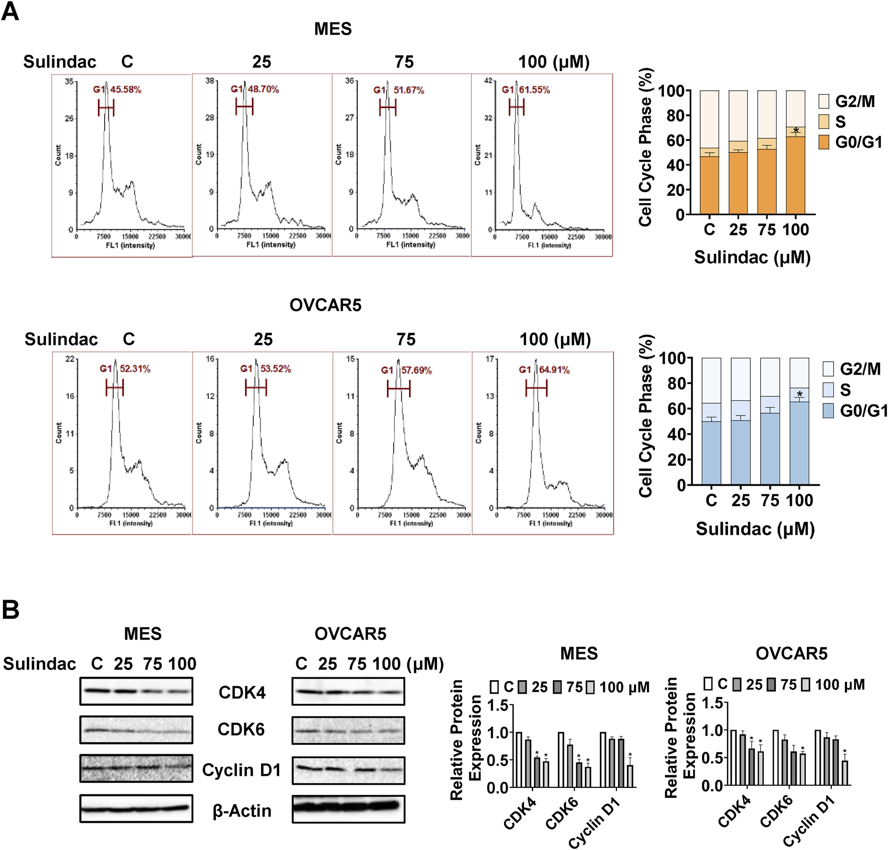 To investigate the potential modulation of cell cycle progression by sulindac, cell cycle profiles were measured via Cellometer after treatment of the MES and OVCAR5 cells with 25, 75 and 100 μM sulindac for 24 h 75 and 100 μM sulindac significantly induced cell cycle G1 phase arrest and decreased G2 phase in both the MES and OVCAR5 cells. Sulindac at a dose of 100 µM increased the G1 arrest phase from 46.74% in untreated cells to 62.8% in MES cells, and from 50.0% to 65.6% in OVCAR5 cells, respectively (Figure 4A). Western blotting results confirmed that after 24 h of sulindac treatment, the expression of cell cycle-related proteins such as CDK4, CDK6, and cyclin D1 were decreased in both the MES and OVCAR5 cells (Figure 4B). These data confirm that sulindac induces cell cycle G1 arrest in OC cells.