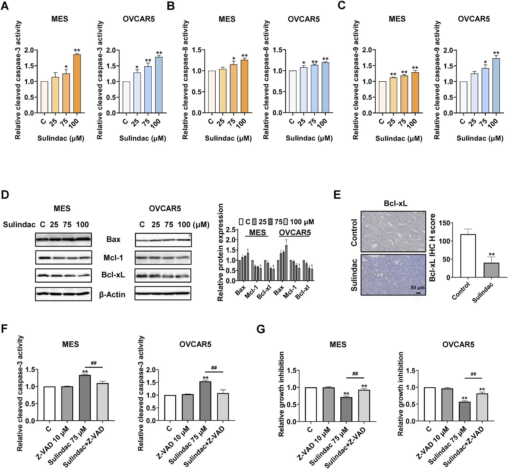 Figure 5. Sulindac induced apoptosis in OC cells and KpB mice. The results of ELISA assay showed that treatment with 75 and 100 µM sulindac for 14 h significantly increased the activities of cleaved caspase 3, 8, and 9 in the MES and OVCAR5 cells (A–C). Sulindac increased the expression of Bax and decreased the expression of Mcl-1 and Bcl-xL in both cell lines (D). IHC results revealed that sulindac inhibited the expression of Bcl-xL in OC tissues of KpB mice (n = 6) (E). Z-VAD-FMK (10 µM) was pretreated with both cell lines for 2 h followed by treatment with sulindac for 14 and 72 h. Pretreatment with Z-VAD-FMK effectively blocked the 75 µM sulindac-induced cleaved caspase 3 activity (F). The MTT assay showed that pretreatment with Z-VAD-FMK significantly reversed sulindac (75 µM)-induced inhibition of cell proliferation in both cell lines (G). Data are presented as mean ± SD. Statistical significance was assessed using two-sided unpaired Student’s t-test (two groups) or one-way ANOVA with Tukey’s post hoc test (multiple groups). *p < 0.05, **p < 0.01, compared with control. #p < 0.05, ##p < 0.01, between groups.